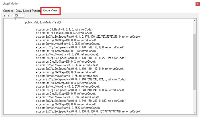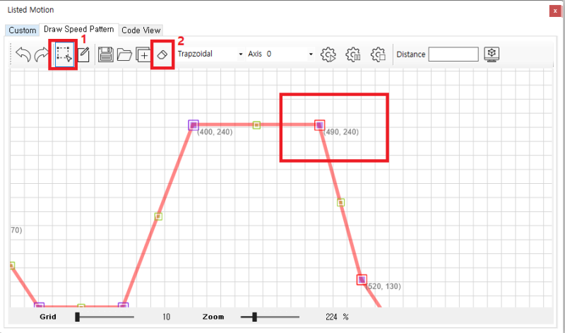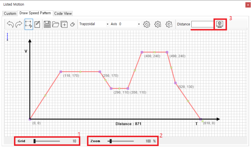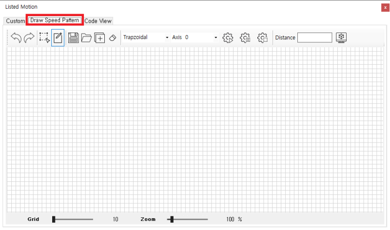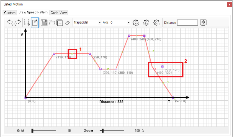 원본 보기토론이전 판역링크책에 추가PDF로 내보내기맨 위로 목차 TEST 방법 CodeView 책 생성기 내 책으로 이 페이지 추가 책 생성기 내 책에서 이 페이지 제거 책 관리(0 페이지) 도움말 List Motion (Custom Velocity) × 리스트 모션 활용 중, 다단계 속도 제어용 프로파일 제작에 대한 안내 페이지입니다. 다단계 속도 제어 다단계의 속도제어가 필요한 경우, 프로파일을 직접 생성할 수 있습니다. TEST 방법 * 1.5.0.10 이상 버전의 IDE에서 확인 가능합니다. ListMotion 화면에서 Draw Speed Pattern 탭 선택 Draw 클릭 후 Drawing 하여 패턴 생성 마우스 우 클릭 시 완료 되며, 마지막 포인트의 속도는 0으로 자동 조정됩니다. 패턴이 완성되면 하단에 이송거리가 표시됩니다. 녹색 포인트(1)를 클릭하여 포인트가 추가됩니다. 보라색 포인트(2)는 패턴을 구성하는 핸들로 드래그 하여 이동 할 수 있습니다. 여러포인트 선택 후 함께 이동할 수 있습니다. Select(1) 선택 후 드래그하여 포인트를 선택할 수 있습니다. 선택된 포인트는 테두리가 빨간색으로 변경됩니다. 포인트 선택 후 Remove(2) 를 클릭하여 포인트를 제거할 수 있습니다. 드래그 하여 여러 포인트를 선택하면 선택된 포인트의 위치를 함께 변경할 수 있습니다. Grid(1)는 단위를 나타냅니다. 포인트(핸들)는 Grid 위에만 존재하며, Drawing 중 포인트 추가 시 가장 가까운 Grid 위에 추가됩니다. Grid 값이 작은 경우 정밀하게 Drawing이 가능하지만, 수정이 어렵습니다. Grid 값이 커질 수록 대략적인 형태만 표현할 수 있지만 수정이 어렵습니다. Zoom(2)을 이용하여 화면을 확대하거나 축소 할 수 있습니다. Sync Distance(2) 버튼을 이용하여 원하는 거리로 설정할 수 있습니다. Grid값이 작을 수록 더 정밀하게 조정됩니다. 1 : SpeedPatternType을 설정합니다. 일반적으로 Trapzoidal을 사용합니다. 2 : 이송할 축을 선택합니다. 3 : ListMotion을 시작합니다. 4 : ListMotion을 일시 정지합니다. 5 : ListMotion을 중지합니다. CodeView 이송이 완료 된 ListMotion은 CodeView(2) 탭에서 Code를 확인할 수 있습니다. * 다단 속도 제어에 대한 속성 값은 다단속도예제 코드 참조