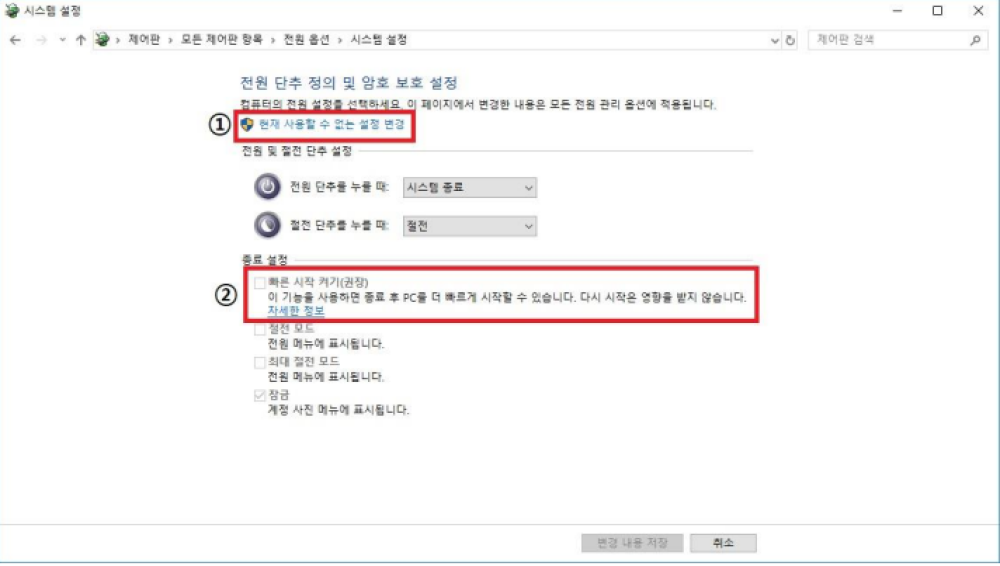 원본 보기토론이전 판역링크책에 추가PDF로 내보내기맨 위로 목차 Windows 10 빠른시작켜기 해제 Contents 1. 빠른시작켜기 해제 2. 절전모드 해제 책 생성기 내 책으로 이 페이지 추가 책 생성기 내 책에서 이 페이지 제거 책 관리(0 페이지) 도움말 빠른시작 해제 페이지 제작 × 빠른시작 해제 페이지 제작에 대한 안내 페이지입니다. Windows 10 빠른시작켜기 해제 Contents 1. 빠른시작켜기 해제 2. 절전모드 해제 1. 빠른시작켜기 해제 빠른시작켜기 : PC를 최대절전모드처럼 사용하는 옵션 절전 모드용 파일에 기록하였다가 전원이 들어오면 다시 파일을 읽는 방식으로 PC를 종료하여도 에러가 지속될 수 있는 문제를 가지거나 윈도우가 제대로 작동하지 않는 특정 문제원인이 될 수도 있음 COMIZOA의 제품을 사용하는 몇몇 업체에서 간헐적으로 위의 문제가 발생하는 것이 확인되어 해제하는 방법을 안내. 제어판에서 보기 기준을 작은 아이콘으로 설정 전원 옵션을 선택 전원 단추 작동 설정을 선택 현재 사용할 수 없는 설정 변경을 누르면 빠른 시작 켜기 체크 박스가 활성화 빠른 시작 켜기를 해제 후 컴퓨터 종료 > 종료 시 ‘다시 시작’을 선택하지 말고 ‘시스템 종료’ 후 재시작 2. 절전모드 해제 전원 옵션의 초기 화면으로 돌아가면 다음과 같이 절전 모드를 해제 가능 <설정 변경>을 누른 뒤 <컴퓨터를 절전모드로 설정>에 <해당 없음> 설정