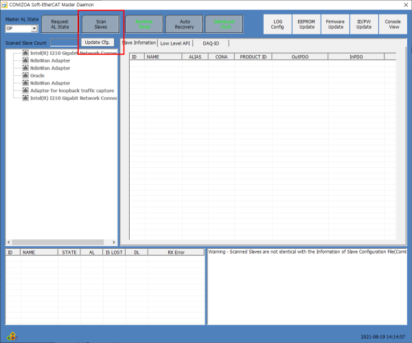 원본 보기토론이전 판역링크책에 추가PDF로 내보내기맨 위로 목차 1. .ini 파일의 슬레이브 정보가 변경되지 않은 경우 증상 원인 해결법 책 생성기 내 책으로 이 페이지 추가 책 생성기 내 책에서 이 페이지 제거 책 관리(0 페이지) 도움말 ComiSWEcatConfig.ini 파일 이슈 × SW 이더캣 마스터 Daemon 실행시 Scanned Slaves are not identical with the Information of Slave Configuration File 라는 메시지가 뜨는 현상에 대한 안내 페이지입니다. 1. .ini 파일의 슬레이브 정보가 변경되지 않은 경우 증상 처음 SW 이더캣 마스터를 셋업 진행할때 Daemon 실행 시 Scanned Slaves are not identical with the Information of Slave Configuration File 메시지 발생 슬레이브 연결 상태를 변경 후 Daemon 실행 시 Scanned Slaves are not identical with the Information of Slave Configuration File 메시지 발생 원인 Daemon에서 슬레이브 스캔을 했을 때 슬레이브 정보가 담긴 ComiSWEcatConfig.ini 파일의 내용과 현재 스캔된 디바이스의 내용이 다름. 해결법 Scan Slaves 클릭 Update Cfg. 클릭 1) 1) 이 버튼 클릭시 ComiSWEcatConfig.ini 파일이 업데이트 됨