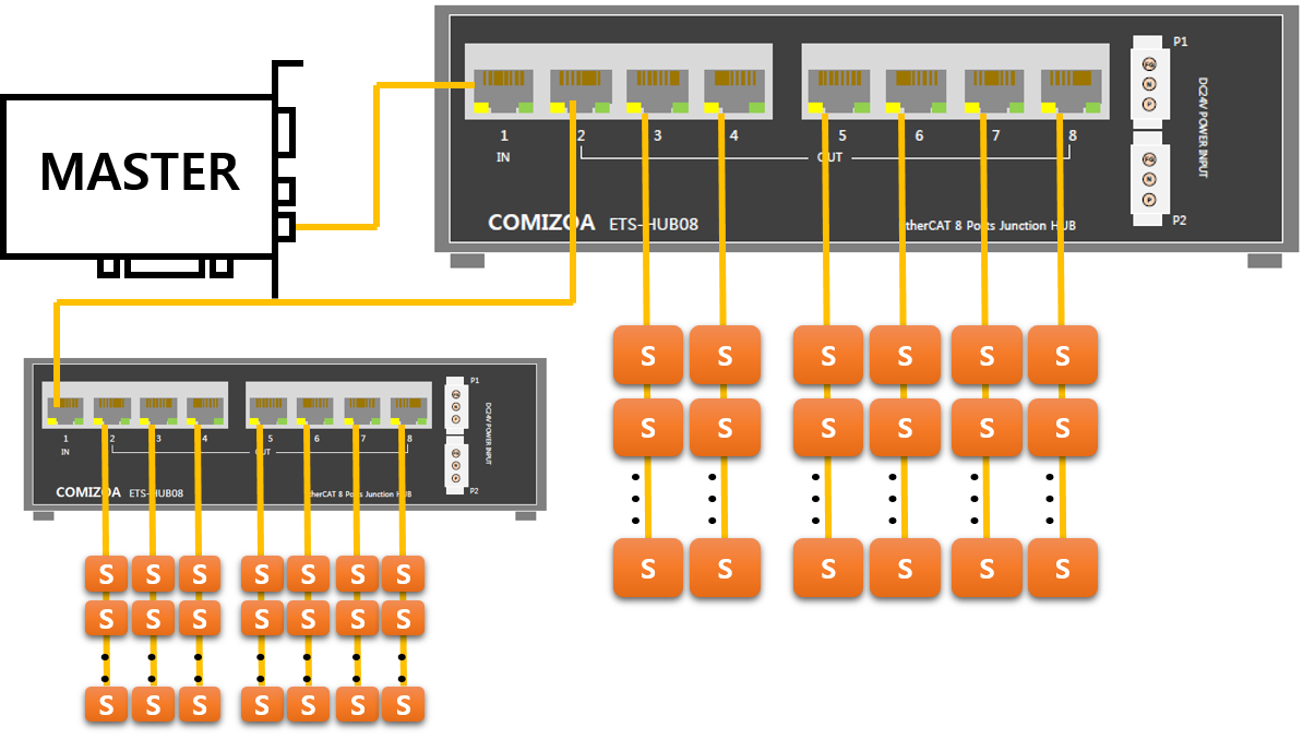 원본 보기토론이전 판역링크책에 추가PDF로 내보내기맨 위로 목차 슬레이브 연결 - 트리 트리 구성 트리 확장 책 생성기 내 책으로 이 페이지 추가 책 생성기 내 책에서 이 페이지 제거 책 관리(0 페이지) 도움말 문서의 이전 판입니다! 슬레이브 연결 - 트리 × 슬레이브 모듈 연결 방법 중 트리 연결에 대한 안내 페이지입니다. 트리 구성 EtherCAT-HUB를 이용하는 경우 트리 구성이 가능합니다. 일반적으로 허브의 1번포트는 'ECAT IN', 나머지 포트는 'ECAT OUT'입니다. 4포트의 경우, 1번포트 - 'ECAT IN' / 2,3,4번 포트 - 'ECAT OUT' 6포트의 경우, 1번포트 - 'ECAT IN' / 2,3,4,5,6번 포트 - 'ECAT OUT' 8포트의 경우, 1번포트 - 'ECAT IN' / 2,3,4,5,6,7,8번 포트 - 'ECAT OUT' 상세 내용은 제조사 매뉴얼 참조 하위 노선에 문제가 발생하는 경우 해당 라인의 모듈들은 Disconnect로 처리됩니다. 상위 노선에 문제가 발생하는 경우, 하위 라인의 모듈 모두 Disconnect로 처리됩니다. 트리 확장 트리는 확장이 가능합니다. × 트리가 증가할 수록 연결에 대한 유연성은 높아지지만, 통신 문제 발생 시 원인 분석이 어려워집니다. 복잡한 구성 및 2개 이상의 허브 사용은 권장하지 않습니다.