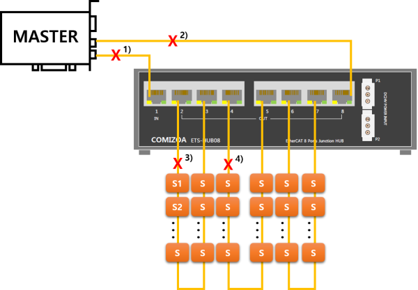 원본 보기토론이전 판역링크책에 추가PDF로 내보내기맨 위로 목차 링 + 링 링 + 링 구성 책 생성기 내 책으로 이 페이지 추가 책 생성기 내 책에서 이 페이지 제거 책 관리(0 페이지) 도움말 링 + 링 × Master Device의 토폴로지 구성에 대한 안내 페이지입니다. 링 + 링 구성 Master와 Hub를 링으로 구성하고, Hub의 하위 라인을 각각의 링으로 구성할 수 있습니다. 1) 또는 2) 또는 3) 또는 4) 위치에 통신 문제 발생 시, 모든 슬레이브에 대해 정상적으로 통신합니다. HUB에서의 링 구성 시, IN / OUT 포트는 지정되어 있습니다. 2번 포트는 3번 포트와 링으로 연결됩니다. 4번 포트는 5번 포트와 링으로 연결됩니다. 6번 포트는 7번 포트와 링으로 연결됩니다. 링 구성 순서는 제한되지 않습니다. 1번 링 없이, 2번 또는 3번 링 구성이 가능합니다. × 동시에 2개 이상의 포인트에서 통신 문제 발생 시, 모든 슬레이브에 대해 Disconnect로 처리될 수 있습니다. 이는 이중화와 별개로, Master까지 Data가 전달되지 않음을 의미합니다. × 복잡한 토폴로지는 연결 유연성을 증가시키시만, 통신 문제 발생 시 디버깅 난이도 또한 증가시킵니다. 노이즈가 발생하는 환경이거나, 문제 발생 시 디버깅이 어려운 환경이라면, 단순한 토폴로지를 사용하시기 바랍니다.