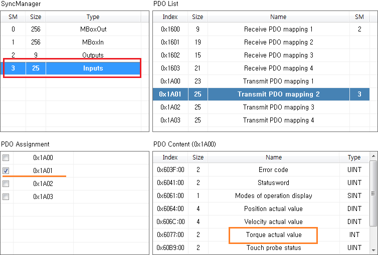 원본 보기토론이전 판역링크책에 추가PDF로 내보내기맨 위로 목차 Process Data 개요 책 생성기 내 책으로 이 페이지 추가 책 생성기 내 책에서 이 페이지 제거 책 관리(0 페이지) 도움말 문서의 이전 판입니다! Process Data × Process Data 설정에 대한 안내 페이지입니다. Process Data 개요 ProcessData 버튼을 클릭하여 활성화합니다. PDO1)를 지원하는Slave의 PDO 목록, Contents 등을 설정합니다. <\callout> <callout type=“info” > SyncManager의 “MBoxOut”, “MBoxIn” 은 메일박스 통신2)을 의미합니다. SyncManager를 클릭하여 항목을 변경할 수 있습니다. “Ouputs”는 마스터에서 슬레이브로 전달되는3) 주기적 데이터(Process Data)를 의미합니다. 선택된 슬레이브의 경우, 4개의 PDO (RxPDO)가 지원되며 그 중 0x1600 PDO가 할당된 것을 확인할 수 있습니다. 이는 마스터에서 슬레이브로 0x1600의 PDO Content에 해당하는 Controlword, Modesof operation, Target position, TouchProbe function 의 값을 주기적으로 전달한다는 뜻입니다. 이 경우, 마스터에서 슬레이브로 Torque 값은 전달되지 않으므로, Torque제어는 사용할 수 없습니다. PDO Assignment 변경 시 체크된 항목이 RxPDO로 할당됩니다. PDO를 0x1601로 변경하는 경우, 0x1601에 해당하는 PDO Content 가 표시됩니다. 0x1600 에 비해 Target torque와 Max motor speed가 추가된 것을 확인할 수 있습니다. 이 경우, Torque제어가 가능합니다. “Inputs”는 슬레이브에서 마스터로 전달되는4) 주기적 데이터(Process Data)를 의미합니다. 선택된 슬레이브의 경우, 4개의 PDO (TxPDO)가 지원되며 그 중 0x1A01 PDO가 할당된 것을 확인할 수 있습니다. 이는 슬레이브에서 마스터로 0x1A01의 PDO Content에 해당하는 항목의 값이 주기적으로 전달된다는 의미입니다. 이 경우, PDO Content에 Torque actual value 항목이 있으므로 torque를 모니터링 할 수 있습니다. PDO List는 슬레이브가 지원하는 모든 PDO 를 List화 한 것이므로 list 자체는 변하지 않지만, PDO Assignment 값에 따라 선택되는 항목은 변경됩니다. 하단의 “Apply to the same product”에 체크한 후, 값을 변경하면 동일한 슬레이브5)에 대해서 모두 변경값이 적용됩니다. RxPDO 및 TxPDO의 종류 및 상세 내용은 슬레이브의 xml에 기술되어 있습니다. 1) CANopen Process Data Object 2) 비주기적, 요청시에만 주고 받는 Data 3) 슬레이브 기준으로는 마스터로부터 수신되는 Data이므로 RxPDO에 해당 4) 슬레이브 기준으로는 마스터로 송신하는 Data이므로 TxPDO에 해당 5) VendorID 와 ProductCode가 같은 슬레이브