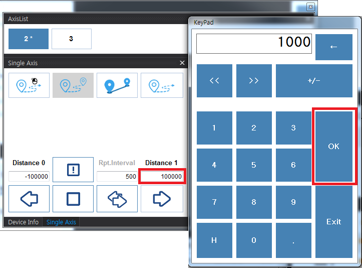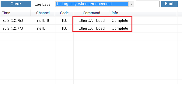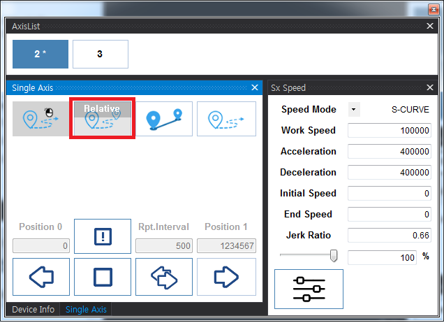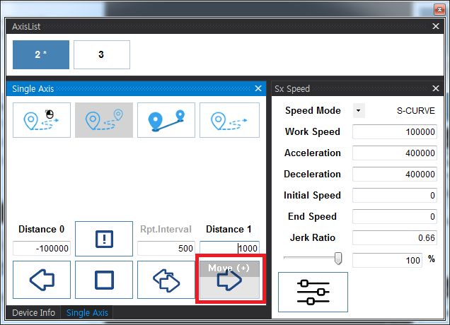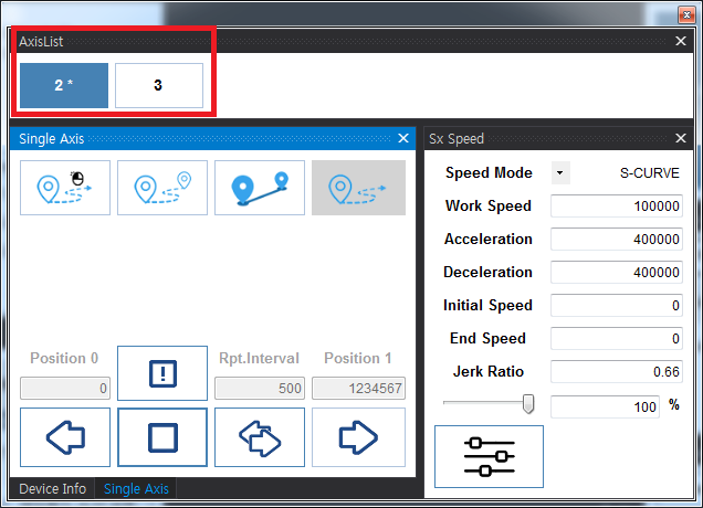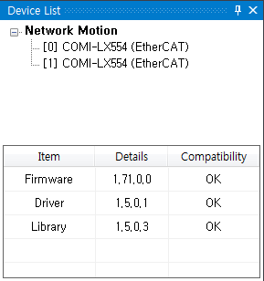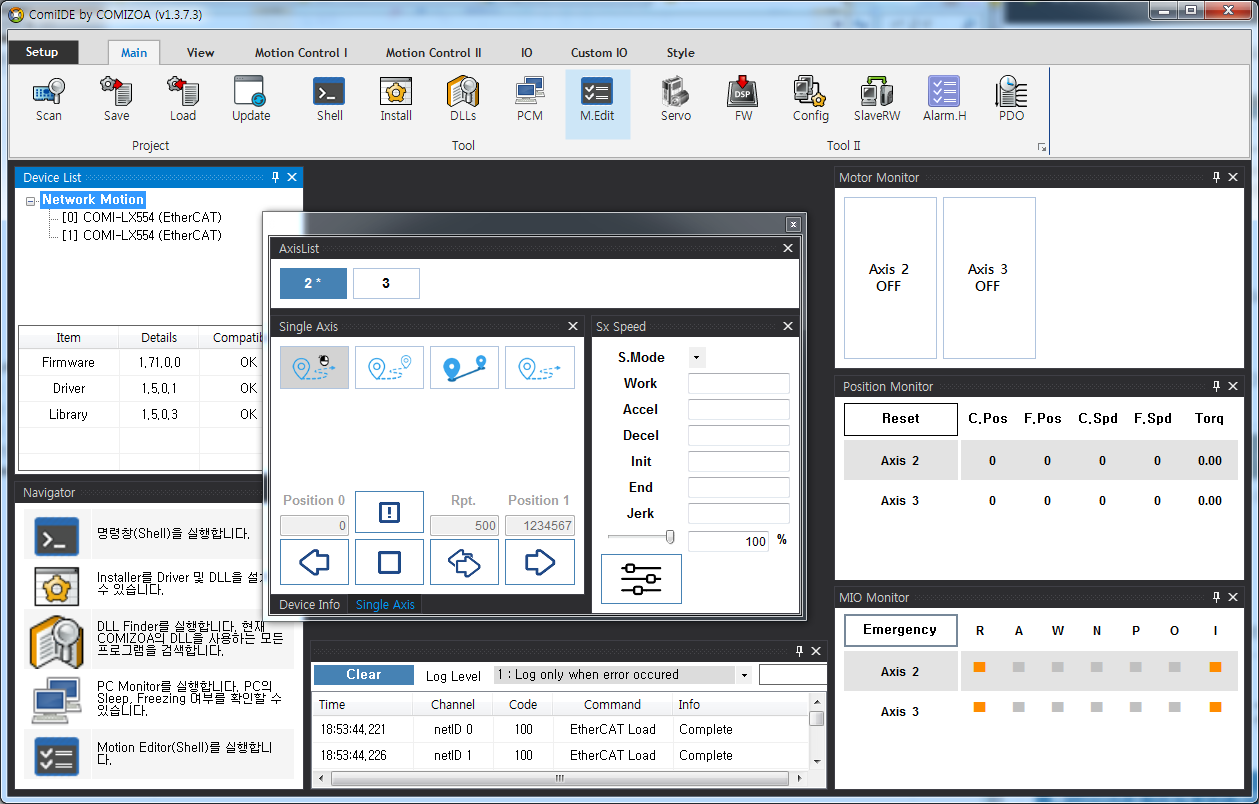 원본 보기토론이전 판역링크책에 추가PDF로 내보내기맨 위로 목차 Test - Motion 실행하기 실행 확인 Servo On Motor State 축 선택 속도설정 이송 이송확인 이송 실패 책 생성기 내 책으로 이 페이지 추가 책 생성기 내 책에서 이 페이지 제거 책 관리(0 페이지) 도움말 Test - Motion × ComiIDE를 이용하여 모션 제어를 하는 방법에 대한 안내 페이지입니다. 실행하기 ComiIDE를 실행합니다. 실행된 화면이 보기와 다를 경우, Style - Multi를 클릭합니다. 실행 확인 DeviceList를 확인하여, 테스트를 위한 제품이 정상적으로 Load 되었는지 확인합니다. Device가 보이지 않는 경우, 디바이스 인식 실패를 참조하시기 바랍니다. LogView를 확인하여 Load 과정에서 에러가 발생하지 않았는지 확인합니다. LogView에 대한 내용은 Log View를 참조하시기 바랍니다. Servo On Motor Monitor의 상태가 다음과 같은지 확인합니다. 원하는 축을 클릭하여 Servo_On 상태로 변경합니다. Motor Monitor는 Motor의 상태를 나타냅니다. 현재 상태는 ServoOn 이후 Stop 상태입니다. Motor Monitor에 대한 내용은 Motor Monitor를 참조하시기 바랍니다. Motor State Motor가 이미 구동 중이거나, 알람이 발생한 경우 해당 상태값을 표시합니다. Motor 상태가 Alarm으로 표시되는 경우, 알람 원인을 제거한 후 클릭하면 알람 클리어가 됩니다. 알람 클리어 후 다시 클릭하면, Servo-On 상태로 변경됩니다. MIO Monitor를 확인하여 Motor가 구동 가능한 상태인지 확인합니다. 일반적으로, Alarm이 발생하였거나, PEL (Limit+) / 또는 NEL(Limit-)에 신호가 들어와 있는 경우, 모터 구동이 되지 않을 수 있습니다. Ready 신호를 지원하는 서보라면, RDY에 신호가 들어와야 합니다. MIO Monitor에 대한 내용은 MIO Monitor를 참조하시기 바랍니다. 축 선택 AxisList에서 이송할 축을 선택합니다. AxisList에 대한 내용은 AxisList를 참조하시기 바랍니다. 속도설정 선택된 축의 속도를 설정합니다. 모터의 분해능에 따라 모터가 빠르게 움직일 수 있으므로, 안전을 위해 최대한 낮은 속도로 이송하는게 좋습니다. Setup 버튼을 클릭해야 변경된 속도가 적용됩니다. 속도설정에 대한 내용은 SetSpeed_Sx를 참조하시기 바랍니다. KeyPad에 대한 내용은 KeyPad를 참조하시기 바랍니다. 이송 짧은 거리의 상대이송1)을 위해 RelativeMove-Mode로 변경합니다. Distance를 클릭하여 이송할 거리를 설정합니다. Move 버튼을 클릭하여 이송을 시작합니다. 단축 이송에 대한 내용은 SingleAxis를 참조하시기 바랍니다. 이송확인 Position Monitor 에서 Command Position 과 Feedback Position을 비교하여 실제 이송이 이루어졌는지 확인합니다. Position Monitor에 대한 내용은 Position Monitor를 참조하시기 바랍니다. 이송 명령만큼 Feedback Position이 변경되었다면, 이송은 정상적으로 수행된 걸로 볼 수 있습니다. Motor 분해능에 따라, 이송이 이루어졌으나 육안으로 확인하기 힘든 경우가 있습니다.2) 이송 실패 이송이 제대로 이루어지지 않았다면, 플랫폼에 따라 Trouble Shooting을 참조하시기 바랍니다 EtherCAT TroubleShooting PCI_Pulse TroubleShooting NEMO TroubleShooting 1) 정해진 거리만큼 이송 2) 만약 육안으로 확인이 힘들다면, 이송 거리를 늘려서 다시 테스트 하시기 바랍니다.