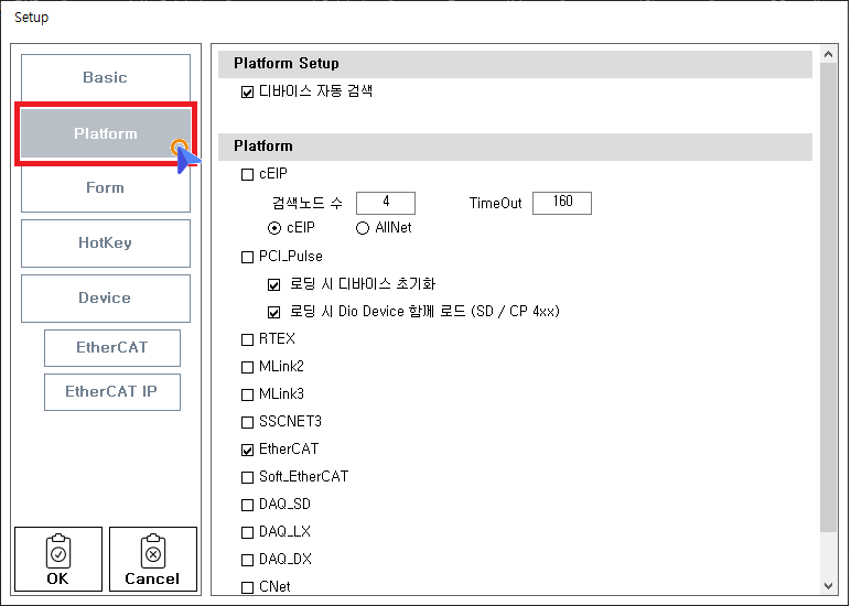 원본 보기토론이전 판역링크책에 추가PDF로 내보내기맨 위로 목차 Platform Platform Setup Platform 책 생성기 내 책으로 이 페이지 추가 책 생성기 내 책에서 이 페이지 제거 책 관리(0 페이지) 도움말 Platform × Master Device 검색에 대한 설정 페이지입니다. Platform Setup 화면에서 Platform 버튼을 선택합니다. Master Device 검색 목록을 설정합니다. Platform Setup 디바이스 자동 검색 PCI 또는 PCI Express 를 통해 설치 된 Master Device 를 검색합니다. 드라이버가 설치되지 않은 경우에도 Device는 검색됩니다1). 이더넷을 통해 제어되는 마스터2)의 경우, Daemon 실행 중이 아니라면 검색되지 않습니다. Platform '디바이스 자동검색' 옵션이 비활성인 경우 유효합니다. 이더넷을 통해 제어되는 마스터3)의 경우, Daemon 실행 중이 아니라면 Daemon 실행 에러를 표시합니다. 하위 설정 항목은 '디바이스 자동검색' 옵션과 무관합니다. '디바이스 자동검색' 옵션이 비활성인 경우 MENU - SCAN 버튼을 우클릭하여 Platform을 설정할 수 있습니다. 1) Deriver 설치 에러 표시 2) , 3) cEIP / EtherCAT_IP