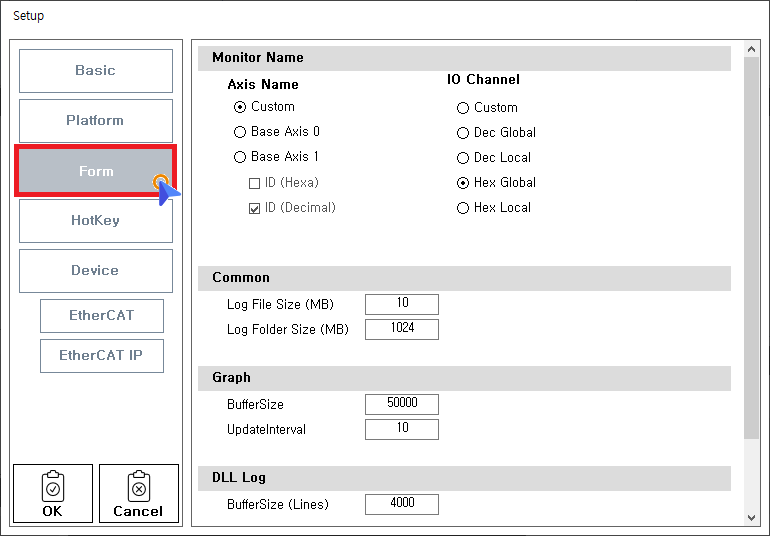 원본 보기토론이전 판역링크책에 추가PDF로 내보내기맨 위로 목차 Form Monitor Name Common Graph DLL Log 책 생성기 내 책으로 이 페이지 추가 책 생성기 내 책에서 이 페이지 제거 책 관리(0 페이지) 도움말 Form × 표시 형식 및 버퍼 사이즈 설정을 위한 안내 페이지입니다. Form Setup 화면에서 Form 버튼을 선택합니다. 축과 채널의 표시형식 및 각종 버퍼 사이즈를 설정할 수 있습니다. 설정 된 값은 IDE 재실행시에도 유효합니다. Monitor Name Axis Name : 각 축의 이름표현 방식을 설정합니다. Custom : 각 축의 이름이 표시됩니다. MotionSetup 창의 AxisName 항목에서 설정할 수 있습니다. Base Axis 0 : 'Axis ##' 형식으로 표시하되, 'Axis 0' 부터 시작합니다. Driver의 Rotary 주소 - 1의 값을 표시합니다. 'Driver 1' 은 'Axis 0'으로 표시됩니다. Base Axis 1 : 'Axis ##' 형식으로 표시하되, 'Axis 1' 부터 시작합니다. Driver의 Rotary 주소와 일치합니다. 'Driver 1' 은 'Axis 1'로 표시됩니다. ID (Hexa) : 16진수로 표시됩니다. 'Base Axis 1' 인 경우, 'Driver 10' 은 'Axis A'로 표시됩니다. ID (Decimal) : 10진수로 표시됩니다. 'Base Axis 1' 인 경우, 'Driver 10' 은 'Axis 10'으로 표시됩니다. 'Base Axis 1' 선택 및, ID(Hexa), ID(Decimal) 항목이 모투 선택 된 경우, 'Driver 10' 은 'Axis 10(A)'로 표시됩니다. AxisName Type 참조 IO Channel : 각 채널(DI/DO)의 이름표현 방식을 설정합니다. Custom : 사용자가 설정한 이름으로 표시합니다. Dec Global : 10진수 Global 채널로 표시합니다. Dec Local : 10진수 Local 채널로 표시합니다. Hex Global : 16진수 Global 채널로 표시합니다. Hex Local : 16진수 Local 채널로 표시합니다. Global Channel 방식은 Slave 모듈이 바뀌어도 채널번호가 연결되는 방식입니다. Local Channel 방식은 Slave 모듈별로 채널 번호가 0에서 시작되는 방식입니다. DI / DO 는 구분됩니다. 16채널 DI 모듈 두개, 16채널 DO 모듈 두개 순서로 연결 된 경우, 두 번째 DO 모듈의 열 번째 채널 번호는 다음과 같습니다. Dec Global : DO 26 Dec Local : DO 10 Hex Global : DO 1A Hex Local : DO A Common Log file Size (MB) : log 파일의 크기를 설정합니다. Log Folder Size (MB) : log 폴더의 크기를 제한합니다. log 폴더의 크기가 설정값 이상이 되는 경우, 가장 오래된 파일부터 삭제됩니다. Graph BufferSize : 그래프의 길이를 설정합니다. UpdateInterval : 그래프의 표시 간격을 ms 단위로 설정합니다. BufferSize : 6000 / UpdateInterval : 10 인 경우, 그래프는 60초의 데이터를 표시합니다. DLL Log BufferSize (Lines) : DLL Logger, Shell 을 이용하여 Logging을 수행하는 경우, BufferSize를 line 단위로 설정합니다.