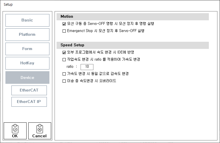 원본 보기토론이전 판역링크책에 추가PDF로 내보내기맨 위로 목차 Device Motion Speed Setup 책 생성기 내 책으로 이 페이지 추가 책 생성기 내 책에서 이 페이지 제거 책 관리(0 페이지) 도움말 Device × Master 종류에 상관없이 지원되는 기능에 대한 안내 페이지입니다. Motion '모션 구동 중 Servo-OFF 명령 시 모션 정지 후 명령 실행' 기능 비활성화시, 모션 구동 여부와 상관없이 Servo-OFF 명령이 실행됩니다. 'Break Type Motor'가 아닌 경우, 관성 및 하중에 의한 이송으로 설비가 손상 될 수 있습니다. 'Emergency Stop 시 모션 정지 후 Servo-OFF 실행' Emergency Stop이 실행 되는 경우, Servo-OFF 명령이 추가 실행됩니다. Speed Setup '외부 프로그램에서 속도 변경 시 IDE에 반영' IDE 외 프로그램에서 속도를 변경하는 경우, IDE의 속도값은 변경 된 값으로 표시되며, 빨간색으로 표시되어, 변경되었음을 알립니다. '작업속도 변경 시 ratio를 적용하여 가속도 변경' ratio : 10 설정 시 WorkSpeed 가 1200 으로 변경되면, 가속도는 12000으로 자동 설정됩니다. 변경 이후 재입력은 가능합니다. 가속도 변경 시 동일 값으로 감속도 변경 이송 중 속도 변경 시 오버라이드 이송 중 속도 Speed Apply 버튼을 클릭하는 경우, 해당 옵션 비활성화 시, 속도 변경 명령은 무시됩니다. 해당 옵션 활성화 시, 설정 속도로 즉시 변경됩니다.
