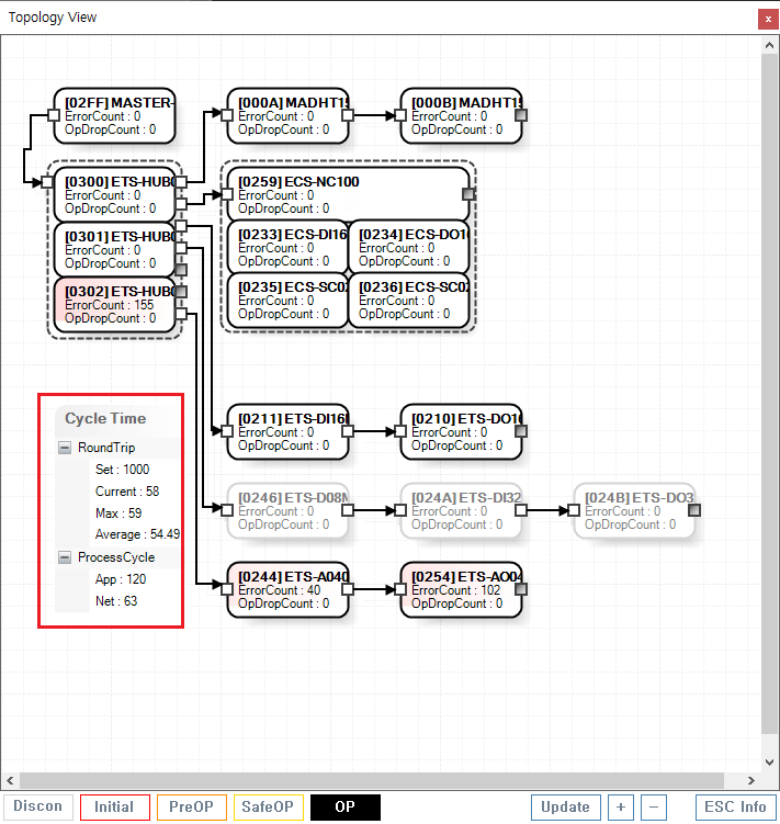 원본 보기토론이전 판역링크책에 추가PDF로 내보내기맨 위로 목차 Communication Time RoundTrip Process Cycle 책 생성기 내 책으로 이 페이지 추가 책 생성기 내 책에서 이 페이지 제거 책 관리(0 페이지) 도움말 Communication Time × 통신 및 연산 시간에 대한 안내 페이지입니다. RoundTrip Set : 1-cycle에 해당하는 통신 주기입니다. 단위는 us 마스터에서 프레임이 송신되는 주기입니다. Current : 마스터에서 송신된 프레임이 되돌아오기까지의 시간(RoundTrip Time)입니다. Current는 항상 Set보다 작습니다. Max : RoundTrip 최대값입니다. Average : RoundTrip 최소값입니다. Process Cycle App : 마스터의 DSP Core 1 동작속도입니다. 모션 및 각종 알고리즘을 처리하는 속도이며, 해당값은 반드시 RoundTrip Set 값보다 작습니다. Net : 마스터의 DSP Core 2 동작속도입니다. 통신과 관련된 연산을 수행하며, 해당값은 반드시 RoundTrip Set 값보다 작습니다.