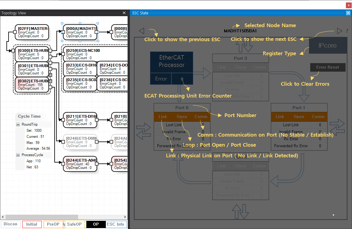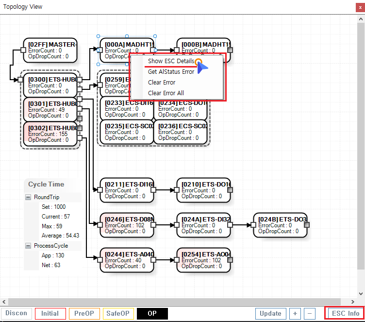 원본 보기토론이전 판역링크책에 추가PDF로 내보내기맨 위로 목차 ESC State Details 책 생성기 내 책으로 이 페이지 추가 책 생성기 내 책에서 이 페이지 제거 책 관리(0 페이지) 도움말 ESC State × EtherCAT 통신칩에 대한 안내 페이지입니다. 슬레이브 선택 후 마우스를 우클릭하여, Show ESC Details버튼을 클릭합니다. 또는 하단 우측의 ESC Info버튼을 클릭합니다. 또는 Main - Motion View - EscState 버튼을 클릭합니다. Details