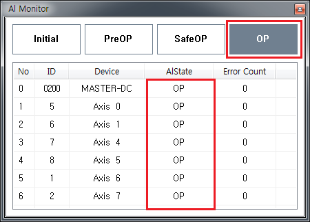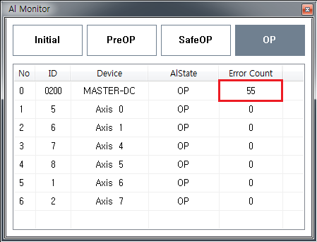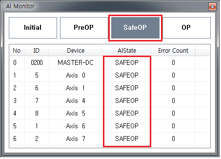원본 보기토론이전 판역링크책에 추가PDF로 내보내기맨 위로 목차 Al Monitor Al Monitor Al Status 책 생성기 내 책으로 이 페이지 추가 책 생성기 내 책에서 이 페이지 제거 책 관리(0 페이지) 도움말 Al Monitor × EtherCAT 모듈의 Al-State와 CRC Error를 확인할 수 있는 Al Monitor에 대한 안내 페이지입니다. Al State에 대한 상세 내용은 Al State를 참조하시기 바랍니다. Al Monitor View 탭의 Monitor 패널에서 Al Monitor를 실행하시면 됩니다. Al Status Al Monitor 폼1)에서 현재 설정된 Al State와 각 모듈의 Al State를 확인할 수 있습니다. 설정값을 변경하는 경우 모든 모듈의 Al State를 변경합니다. 모듈의 상태에 따라 Al State 가 설정값과 다를 수 있습니다. SafeOP 이상으로 변경되지 않는 경우 정상적인 제어가 되지 않을 수 있습니다. CRC Error CRC Error가 발생하는 경우 “Error Count” 에 표시됩니다. 특정 위치에서 CRC 에러가 지속적으로 증가한다면 통신 선로의 점검이 필요합니다. 에러는 다음의 경우 클리어 됩니다. Al State가 OP로 전환 에러가 표시된 셀을 클릭 MASTER-DC의 Error Count 셀을 클릭하는 경우, 모든 모듈의 ErrorCount 가 클리어 1) 해당 폼이 보이지 않는 경우 View 탭의 Monitor 패널에서 AlMonitor 선택