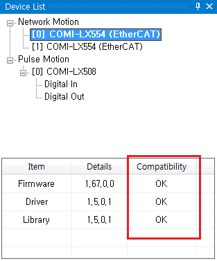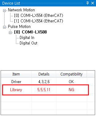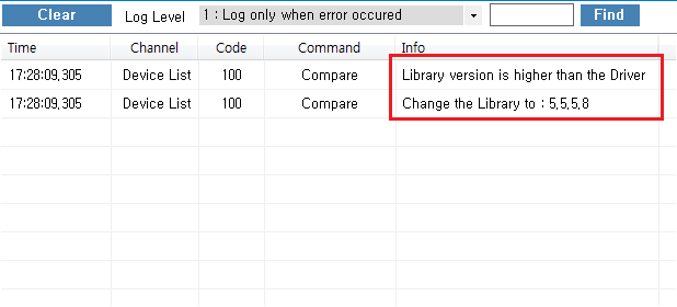 원본 보기토론이전 판역링크책에 추가PDF로 내보내기맨 위로 목차 Version Compare Trouble Shooting 책 생성기 내 책으로 이 페이지 추가 책 생성기 내 책에서 이 페이지 제거 책 관리(0 페이지) 도움말 Version Compare × SW 버전 호환성 확인에 대한 안내 페이지입니다. × Firmware - Driver - Library 간 호환되지 않는 버전이 적용된 경우, 오동작 할 수 있습니다. 반드시 호환되는 버전임을 확인 후 테스트 하시기 바랍니다. Device List 폼1)에서 SW 버전 호환성을 확인할 수 있습니다. DSP 가 있는 제품은 FW-Driver-DLL 간 버전을 비교하며, DSP가 없는 제품은 Driver-DLL간 버전을 비교합니다. 호환되는 버전의 경우 “OK”로 표시됩니다. 호환되지 않는 버전의 경우 “NG”로 표시됩니다. 해당셀을 클릭하면, LogView 폼2)에서 상세 정보를 확인할 수 있습니다. Trouble Shooting 버전이 일치하지 않는 경우, Software Update 를 진행하시기 바랍니다. 1) Device List 폼이 없는 경우, View 탭의 Basic 패널에서 List 를 클릭하시기 바랍니다. 2) LogView 폼이 없는 경우, View 탭의 Basic 패널에서 Log 를 클릭하시기 바랍니다.
