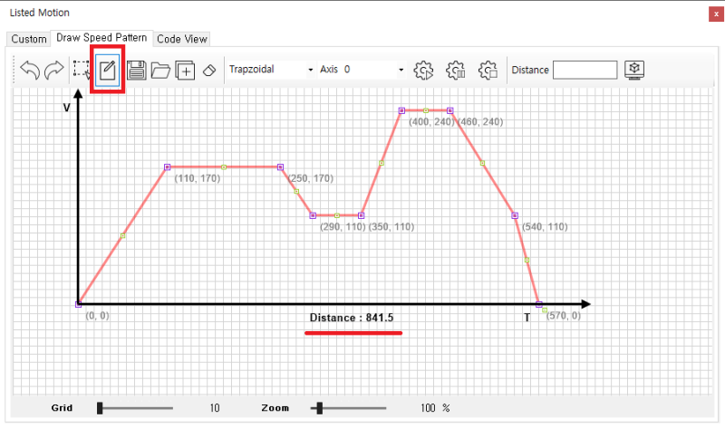 원본 보기토론이전 판역링크책에 추가PDF로 내보내기맨 위로 목차 TEST 방법 CodeView 책 생성기 내 책으로 이 페이지 추가 책 생성기 내 책에서 이 페이지 제거 책 관리(0 페이지) 도움말 List Motion (Custom Velocity) × 리스트 모션 활용 중, 다단계 속도 제어용 프로파일 제작에 대한 안내 페이지입니다. 다단계 속도 제어 다단계의 속도제어가 필요한 경우, 프로파일을 직접 생성할 수 있습니다. TEST 방법 * 1.5.0.10 이상 버전의 IDE에서 확인 가능합니다. ListMotion 화면에서 Draw Speed Pattern 탭 선택 Draw 클릭 후 Drawing 하여 패턴 생성 마우스 우 클릭 시 완료 되며, 마지막 포인트의 속도는 0으로 자동 조정됩니다. 패턴이 완성되면 하단에 이송거리가 표시됩니다. 녹색 포인트(1)를 클릭하여 포인트가 추가됩니다. 보라색 포인트(2)는 패턴을 구성하는 핸들로 드래그 하여 이동 할 수 있습니다. 여러포인트 선택 후 함께 이동할 수 있습니다. Select(1) 선택 후 드래그하여 포인트를 선택할 수 있습니다. 선택된 포인트는 테두리가 빨간색으로 변경됩니다. 포인트 선택 후 Remove(2) 를 클릭하여 포인트를 제거할 수 있습니다. 드래그 하여 여러 포인트를 선택하면 선택된 포인트의 위치를 함께 변경할 수 있습니다. Grid(1)는 단위를 나타냅니다. 포인트(핸들)는 Grid 위에만 존재하며, Drawing 중 포인트 추가 시 가장 가까운 Grid 위에 추가됩니다. Grid 값이 작은 경우 정밀하게 Drawing이 가능하지만, 수정이 어렵습니다. Grid 값이 커질 수록 대략적인 형태만 표현할 수 있지만 수정이 어렵습니다. Zoom(2)을 이용하여 화면을 확대하거나 축소 할 수 있습니다. Sync Distance(2) 버튼을 이용하여 원하는 거리로 설정할 수 있습니다. Grid값이 작을 수록 더 정밀하게 조정됩니다. 1 : SpeedPatternType을 설정합니다. 일반적으로 Trapzoidal을 사용합니다. 2 : 이송할 축을 선택합니다. 3 : ListMotion을 시작합니다. 4 : ListMotion을 일시 정지합니다. 5 : ListMotion을 중지합니다. CodeView 이송이 완료 된 ListMotion은 CodeView(2) 탭에서 Code를 확인할 수 있습니다. * 다단 속도 제어에 대한 속성 값은 다단속도예제 코드 참조