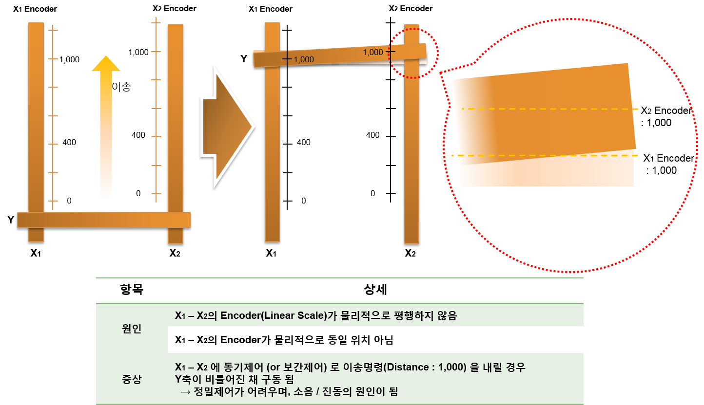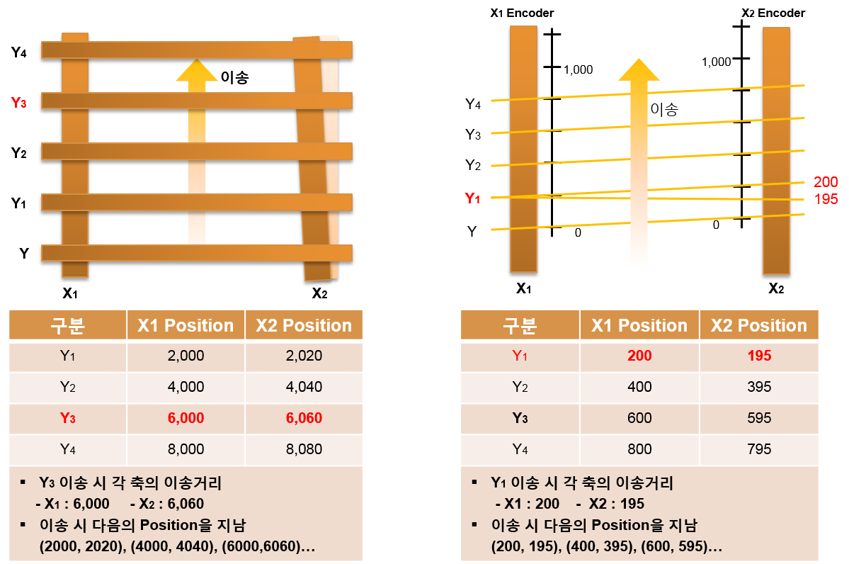 원본 보기토론이전 판역링크책에 추가PDF로 내보내기맨 위로 목차 갠트리 로봇 갠트리 제어 갠트리 보상제어의 필요성 갠트리 보상 테이블 책 생성기 내 책으로 이 페이지 추가 책 생성기 내 책에서 이 페이지 제거 책 관리(0 페이지) 도움말 What's Gantry × 갠트리의 기본 개념에 대한 안내 페이지입니다. 갠트리 로봇 긴 직선 형태의 두 액츄에이터(Actuator)를 넓은 간격을 두고 나란히 놓고 그 중간에 보 또는 평판을 얹은 형태를 가진다 두 액츄에이터를 동시에 구동하여 중간에 놓여진 보 또는 평판을 액츄에이터의 길이방향으로 이송하게 된다. 주로 무거운 부하를 운반할 때 많이 사용한다 갠트리 제어 갠트리로봇이 두 액츄에이터 사이에 놓여진 보 또는 평판을 이송할 때 평행하게 이송하여야 한다. 갠트리축은 물리적으로 두 개의 축으로 구성되지만, 다른 축들과의 보간제어등을 원활히 수행하기 위해 논리적으로는 하나의 축으로 운용되어야 한다. 갠트리 제어란 두 개의 갠트리를 구성하는 모터가 동시에 이송되도록 하며, 또한 두 개의 모터가 하나의 논리적인 모터로 인식되도록 하는 제어를 말한다. 갠트리 보상제어의 필요성 마스터와 슬레이브에 동일한 위치이송 명령을 줄 경우, 여러 가지 이유로 슬레이브의 위치는 적절치 못할 수 있다. 이 경우, 슬레이브는 이송량에 대응하여 적절히 보상된 이송 명령이 이루어져야 한다. 갠트리 보상 테이블 일반적으로, 제어기는 마스터 위치에 대응되는 슬레이브의 위치를 위해 미리 작성된 보상 테이블을 참조한다. 보상 테이블은 (슬레이브의 명령 위치, 슬레이브의 실제 위치) 형식의 순서쌍으로 구성된다. (1000,998) (3000,2994)… 와 같은 테이블이 있다면, 슬레이브에 1000의 위치이송명령을 줄 경우, 실제로는 998 위치로 이송해야 한다 슬레이브에 2000의 위치이송명령을 줄 경우, 실제로는 1996 위치로 이송해야 한다 슬레이브에 3000의 위치이송명령을 줄 경우, 실제로는 2994 위치로 이송해야 한다. comizoa, 커미조아, ide, ethercat, gantry, 갠트리, 보상 comizoa 커미조아 ide ethercat gantry 갠트리 보상