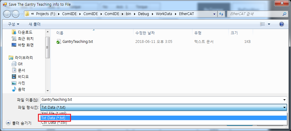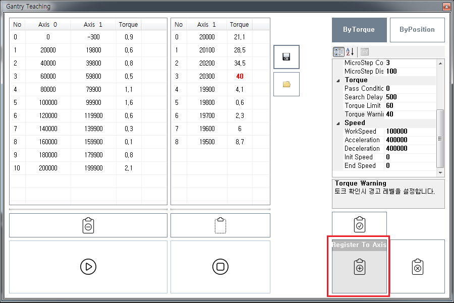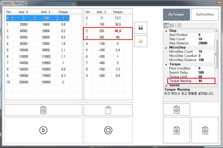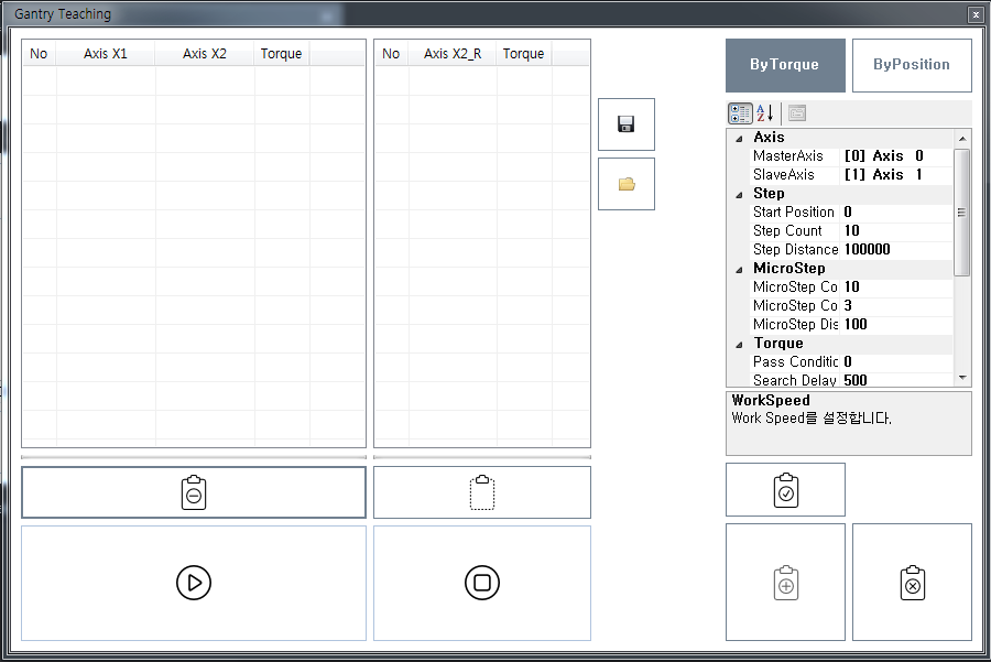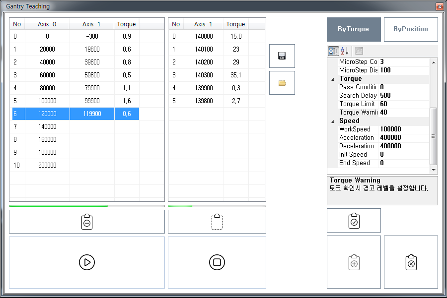 원본 보기토론이전 판역링크책에 추가PDF로 내보내기맨 위로 목차 구동원리 시작하기 설정 사용 책 생성기 내 책으로 이 페이지 추가 책 생성기 내 책에서 이 페이지 제거 책 관리(0 페이지) 도움말 Gantry Teaching × 토크 피드백을 이용해 보상맵을 작성하는 방법에 대한 안내 페이지입니다. 구동원리 Master 축과 Slave 축, Step Distance와 MicroStep Distance 를 설정합니다. Gantry 축은 Step Distance 만큼 이송 후, MicroStep 만큼 앞 뒤로 움직이며, 토크가 최저가 되는 위치를 찾습니다. 찾은 위치가 Master 축에 대한 Slave 축의 보정위치가 됩니다. Step Count 만큼 위의 동작을 반복하며 결과값을 table로 만듭니다. Table이 모두 만들어진 후, Master-Slave 기능을 이용해 제어합니다. 유저는 Master 축을 제어하며, Slave 축은 등록된 테이블에 따라 위치가 보상됩니다. Table 사이의 위치는 비례보상됩니다. (1000, 990), (2000, 994) 라는 두개의 테이블이 등록되었다면, 마스터가 1500의 위치일때, Slave는 992의 위치로 보상됩니다. 시작하기 ComiIDE의 Gantry 를 선택하여 Gantry Teaching 을 시작합니다. 설정 Axis Master Axis : Gantry의 Master 축을 설정합니다. SlaveAxis : Gantry의 Slave 축을 설정합니다. Step Start Position : Teaching 시작위치 입니다. 홈복귀 완료 이후 Start Position을 0으로 설정하는 것을 권장합니다. Step Count, Step Distance : 총 거리를 몇개로 나누어 측정할지에 대한 설정값입니다. 총 거리를 Step Count 로 나누어 측정합니다. Step Distance는 한 단위의 거리이며, 총거리는 StepCount * StepDistance 가 됩니다. 예를 들어, Step Count = 10, Step Distance = 100 이라면, 총 거리는 1,000 이 됩니다. MicroStep MicroStep Count : 최적의 토크값을 찾기 위해 움직이는 횟수입니다. + / - 방향으로 각각 최대 MicroStep Count 만큼 움직입니다. MicroStep Count 만큼 동작하지 않았더라도, 원하는 조건이 충족되면 다음 Step으로 넘어갑니다. MicroStep CountLimit : MicroStep 이송 중 Torque가 일정 방향으로 CountLimit만큼 증가하거나 감소하면 해당 방향의 이송을 끝냅니다. 예를 들어, CountLimit = 3이고 1,2,3 회의 토크값이 각각 1.2, 2.1, 2.5 라면, 이후로도 계속 토크값이 증가할 거라 간주합니다. 이 경우, + 방향의 이송을 끝내고 - 방향 이송을 시작합니다. MicroStep Distance : MicroStep 이송 거리를 설정합니다. 이 값이 작을 수록 정밀한 측정이 가능합니다. Torque Pass Condition : Pass Condition 값보다 작은 토크가 측정될 경우, 해당값을 최저 토크로 간주하고 다음 Step으로 넘어갑니다. Search Delay : Micro Step 이송 후 Delay 시간입니다. 토크 안정화를 위한 시간이며, 응답성이 느린 축이라면 해당 값을 높게 설정하는게 좋습니다. Torque Limit : 해당값보다 높은 토크 측정 시, 다음 스텝으로 넘어갑니다. Torque Warning : 해당값보다 높은 토크 측정 시, 측정은 계속되지만 해당 스텝은 Warning으로 표시됩니다 Speed Teaching 시 적용되는 속도에 대한 설정입니다. 사용 시작 위치에서 ApplySetup 을 클릭하여 설정값을 적용합니다. Start 을 클릭하여 Teaching 을 시작합니다. Teaching이 완료될때까지 설정 내용에 따라 자동으로 Teaching이 진행됩니다. Teaching이 완료되면 Register To Axis를 클릭하여 테이블을 등록합니다. 이 때, Master-Slave 모드로 자동 변경됩니다. Step을 선택하면 Step에서 측정된 MicroStep의 정보를 확인할 수 있습니다. Save 를 클릭하여 txt 형식으로 저장하면 UserApplication 에서 API 를 이용해 한번에 테이블을 불러올 수 있습니다. comizoa, 커미조아, ide, ethercat, gantry, 갠트리, 보상, 티칭 comizoa 커미조아 ide ethercat gantry 갠트리 보상 티칭