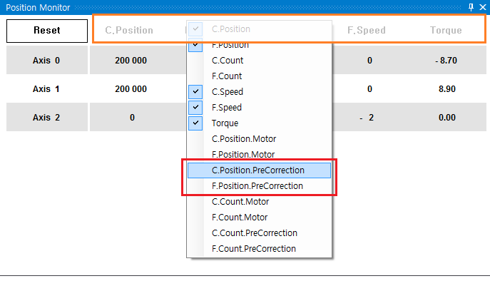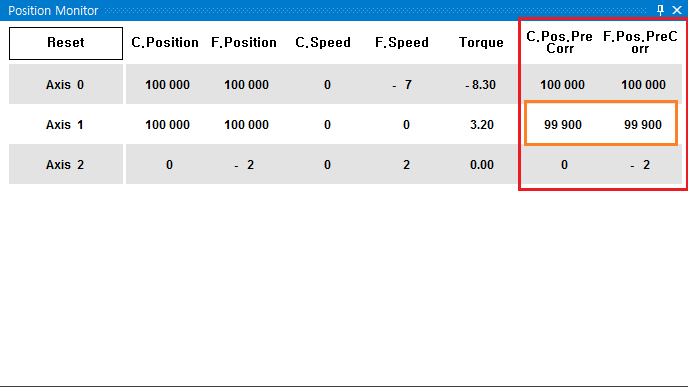 원본 보기토론이전 판역링크책에 추가PDF로 내보내기맨 위로 목차 보상 후 위치표시 실제 모터 위치 확인 방법 책 생성기 내 책으로 이 페이지 추가 책 생성기 내 책에서 이 페이지 제거 책 관리(0 페이지) 도움말 Gantry 보상 확인 × Gantry 보상테이블 적용 여부 확인에 대한 안내 페이지입니다. 보상 후 위치표시 Gantry 보상테이블을 적용해도 Command Position, Feedback Position은 보상 전 위치를 표시합니다. 모터가 1000의 위치에서 보상테이블에 의해 100을 보상 받는다고 할때, 실제 모터 위치는 1100이 되지만, 표시값은 여전히 1000이 됩니다. 실제 모터 위치 확인 방법 Position Monitor 에서 제목 부분을 우클릭하여 “C.Position.PreCorrection”, “F.Position.PreCorrection”을 활성화합니다. “C.Position.PreCorrection” 은 보상 전 Command Position을 의미합니다. “F.Position.PreCorrection” 은 보상 전 Feedback Position을 의미합니다. Position이 아닌 Count로 모니터링 시에는 “C.Count.PreCorrection”, “F.Count.PreCorrection”을 활성화합니다 추가된 항목을 통해 보상 전 위치 (모터의 실제 위치)를 확인할 수 있습니다. comizoa, 커미조아, ide, ethercat, gantry, 갠트리, 보상, 확인 comizoa 커미조아 ide ethercat gantry 갠트리 보상 확인