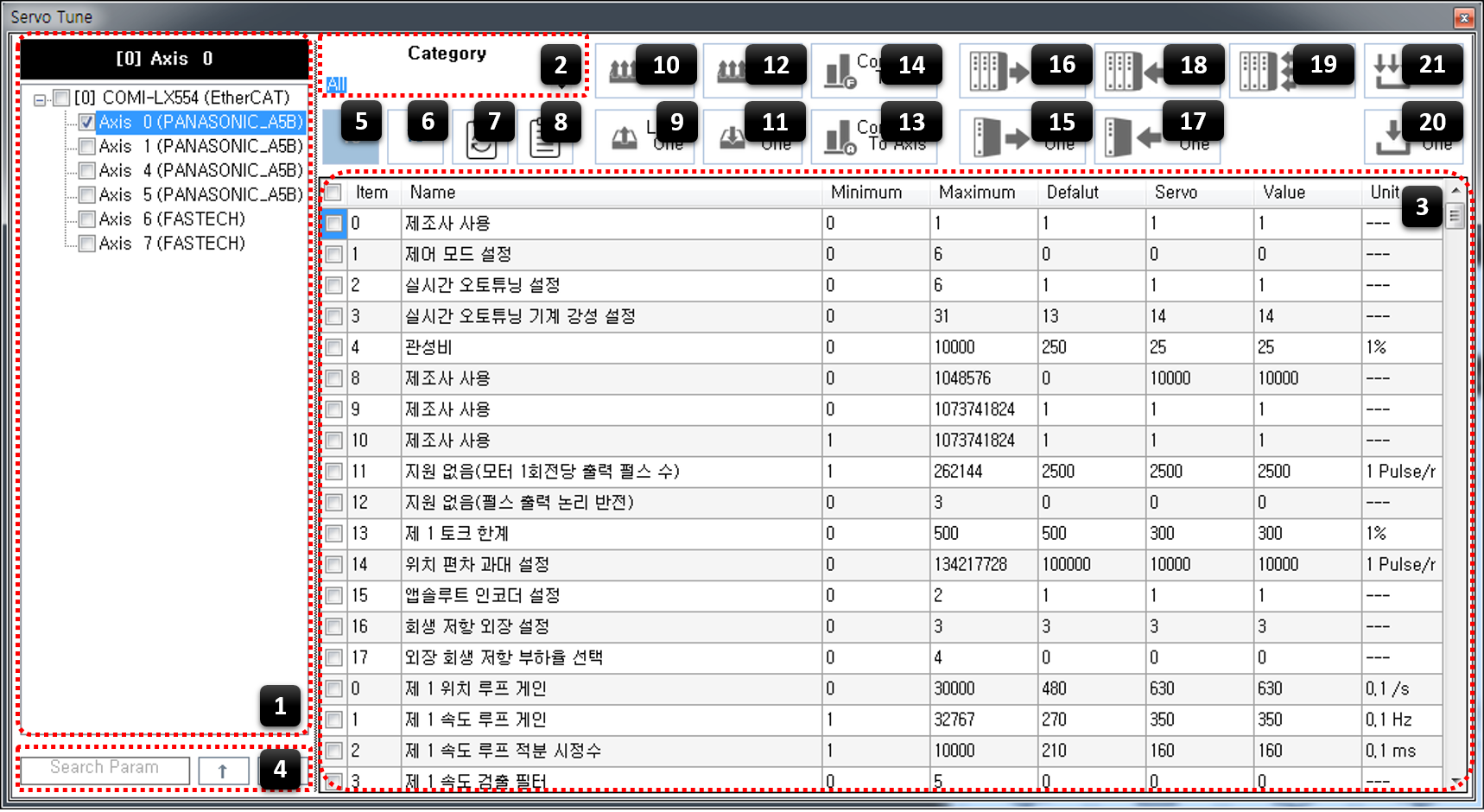원본 보기토론이전 판역링크책에 추가PDF로 내보내기맨 위로 책 생성기 내 책으로 이 페이지 추가 책 생성기 내 책에서 이 페이지 제거 책 관리(0 페이지) 도움말 기능 및 사용방법 × ServoTunes의 기능 및 기본적인 사용방법에 대한 안내 페이지입니다. 1 AxisList 현재 선택된 축과 편집할 수 있는 축의 목록을 표시합니다. LoadOne / SaveOne / ReadOne 등 One으로 끝나는 명령은 현재 선택된 축이 대상입니다. LoadAll / SaveAll / ReadAll 등 All로 끝나는 명령은 축 목록에서 체크된 축이 대상입니다. Check 다음의 경우 ReadOne 실행시 “Axis 4” 에 대한 파라메타를 읽어옵니다. (선택된 축) ReadAll 실행 시 “Axis 0” 에 대한 파라메타를 읽어옵니다. (체크된 축) 2 Category 선택된 축이 파라메타 그룹을 지원하는 경우 Category로 표시합니다. Category 변경 시 표시되는 파라메타 목록이 변경됩니다. 3 Parameter List 파라메타 목록입니다. Minimum : 설정 가능한 최소값입니다. Maximum : 설정 가능한 최대값입니다. Default : 드라이버 출하 시 설정되는 기본값입니다. 1) Servo : 드라이버로부터 읽어드린 파라메타 값입니다. Value : ServoTunes에 설정된 값입니다. 'Servo' 와 다른 상태에서 Write 할 경우 해당값이 서보에 기록됩니다. Value에 해당하는 cell을 클릭하여 값을 편집할 수 있습니다. 일부 제품의 경우 MotionIO 기능할당 및 로직 변경이 가능합니다. 4 Search Param 이름으로 파라메타를 찾을 수 있습니다. 5 10진수 보기 6 16진수 보기 파라메타의 값을 10진수 또는 16진수로 표시합니다. 파라메타의 Minimum, Maximum, Default, Servo, Value 값이 모두 변경됩니다. 7 Param Reset 선택된 축의 'Servo' / 'Value' 값을 모두 삭제합니다. 드라이버의 값은 삭제되지 않으며, Read 시 다시 읽오올 수 있습니다. 8 View Details 파라메타의 Index, DataType, DataSize 등 숨겨진 정보를 확인할 수 있습니다. 9 LoadOne 10 LoadAll 파일로부터 파라메타 정보를 읽어옵니다.2) 축번호를 기준으로 읽어 온 파일의 정보가 드라이버의 실제 정보와 다를 경우 해당 축은 제외됩니다. ex) 파일의 정보는 Omron / 실제 드라이버는 Panasonic 인 경우 읽어오지 않음 11 SaveOne 12 SaveAll 파라메타 정보를 파일로 저장합니다. Read를 진행하지 않은 축은 무시합니다. 13 CompareToAxis 다른 축과 파라메타를 비교하여 다른 값을 표시합니다. 14 CompareToFile SaveOne 을 통해 저장된 파라메타와 비교하여 다른 값을 표시합니다. 15 ReadOne 16 ReadAll 드라이버로부터 파라메타를 읽어옵니다. Load를 진행하지 않은 경우 'Value' 값에도 'Servo'와 같은 값이 기본으로 입력됩니다. 17 WriteOne 선택된 축의 변경된 Value 값을 드라이버에 기록합니다. 18 Write 1:N 선택된 축의 변경된 Value 값을 체크된 모든 드라이버에 기록합니다. 19 Write N:N 체크된 모든 축의 변경된 Value 값을 각각의 드라이버에 기록합니다. 20 EepOne 21 EepAll 저장가능한 모든 파라메타를 서보 드라이버의 EEPROM에 저장합니다. × Warning! ServoTunes는 다축의 파라메타 편집을 돕기 위해 만들어졌습니다. 각 드라이버의 파라메타 편집에 관한 주의점은 각 드라이버 제조사의 메뉴얼을 참조하시기 바랍니다. comizoa, 커미조아, ide, ethercat, 기능, servotunes, 서보튠즈, 사용방법 1) 서보의 펌웨어 버전에 따라 해당값이 맞지 않을 수 있음 2) ServoTunes 에서 저장한 파일만 가능 comizoa 커미조아 ide ethercat 기능 servotunes 서보튠즈 사용방법