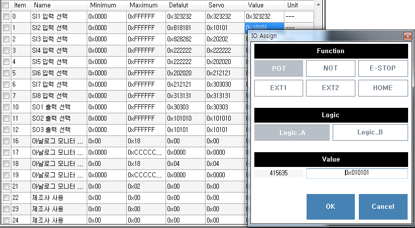 원본 보기토론이전 판역링크책에 추가PDF로 내보내기맨 위로 책 생성기 내 책으로 이 페이지 추가 책 생성기 내 책에서 이 페이지 제거 책 관리(0 페이지) 도움말 MotionIO 할당 & 로직 변경 × LIMIT, ORG 등의 MotionIO 할당 및 로직 변경 방법에 대한 안내 페이지입니다. 이더캣 드라이버 중 파나소닉, 옴론 등 일부 제품에 대해서만 지원하며, 파나소닉 제품을 기준으로 안내합니다. 1 MotionIO 파라메타 찾기 Category를 '분류 4 (IO/Monitor) 로 변경합니다. 파라메타를 쉽게 찾기 위한 방법이므로 Search Param 등을 활용해도 됩니다. 2 값 변경하기 변경을 원하는 파라메타의 Value를 클릭하면, IO Assign 폼이 나타납니다. 예시는 현재 SI2 pin이 “POT”에 할당되어 있으며, A접점으로 동작하고 있다는 의미입니다. Function 이나 Logic 을 변경하면, Value 값이 변경됩니다. Function에 없는 기능을 할당하기 위해서는 Value값을 직접 입력해야 합니다. 이 경우에도, Logic은 UI 내의 버튼을 선택하여 변경할 수 있습니다. OK를 클릭하면 변경된 값이 입력됩니다. comizoa, 커미조아, ide, ethercat, 기능, servotunes, 서보튠즈, mio, 할당, 변경 comizoa 커미조아 ide ethercat 기능 servotunes 서보튠즈 mio 할당 변경