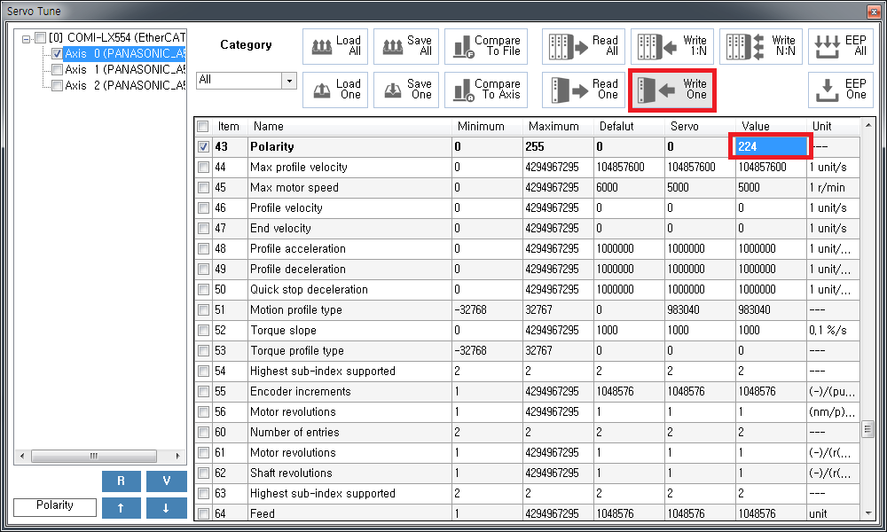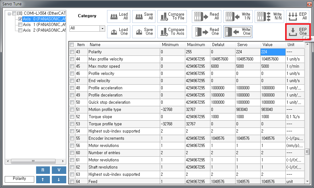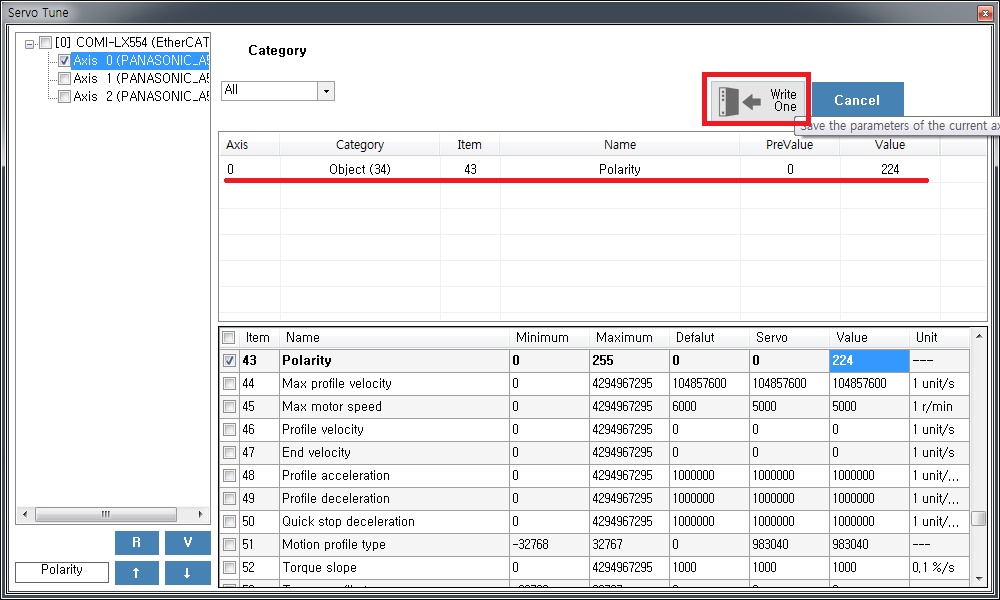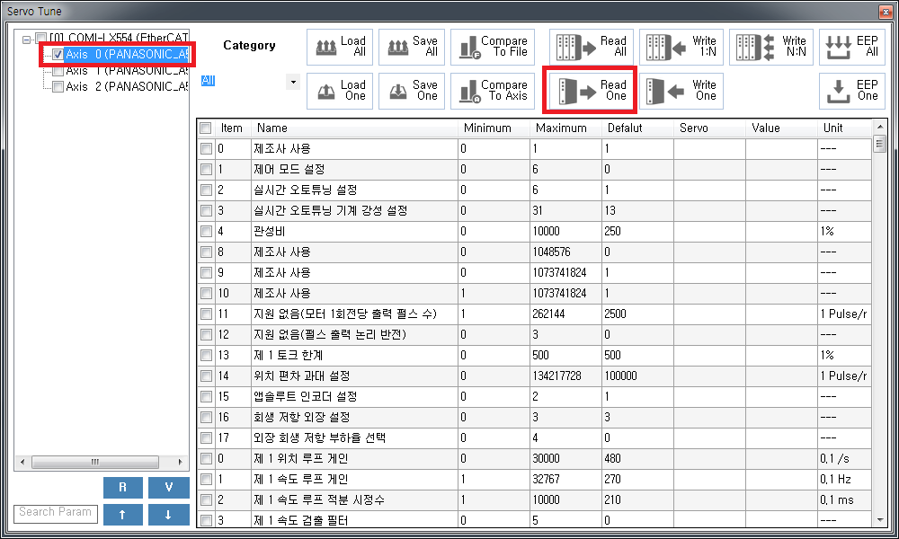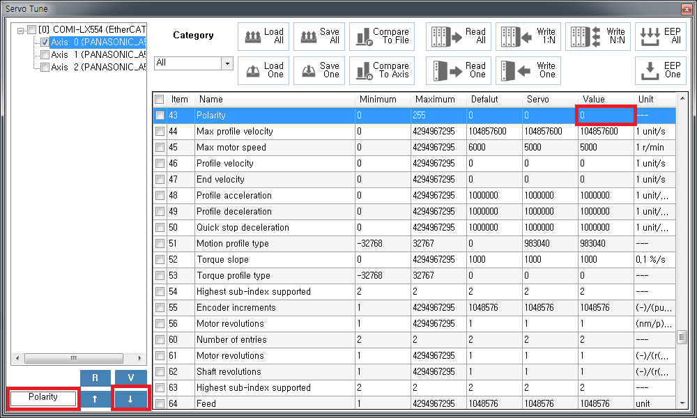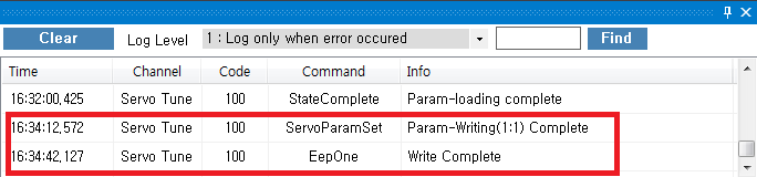 원본 보기토론이전 판역링크책에 추가PDF로 내보내기맨 위로 책 생성기 내 책으로 이 페이지 추가 책 생성기 내 책에서 이 페이지 제거 책 관리(0 페이지) 도움말 모터 구동방향 변경 × EtherCAT 모터의 구동방향을 반대로 바꾸는 방법에 대한 안내 페이지입니다. 드라이버에 따라 지원하지 않을 수 있습니다. 1 ComiIDE 의 Main 탭에서 Servo 실행 2 대상 축 (모터의 방향을 바꾸기 위한) 선택 후 ReadOne 클릭 3 하단 검색창에 Polarity 입력 후 ↓ 클릭 4 Value 칸을 클릭하여 값1) 변경 설정치 내용 0 위치, 속도, 토크의 부호 반전 없음 224 위치, 속도, 토크의 부호 반전 있음 상기 이외 5 WriteOne 클릭 6 변경 값 확인 후 WriteOne 클릭 7 EepRom 버튼 클릭 8 하단 Log 창에서 상기 과정이 정상적으로 동작되었는지 확인 × 모든 과정 종료 후 반드시 서보의 전원을 재투입 해야 합니다. comizoa, 커미조아, ide, ethercat, 기능, servotunes, 서보튠즈, 모터, 구동방향 1) 드라이버에 따라 다름, 하기 내용은 파나소닉 기준 comizoa 커미조아 ide ethercat 기능 servotunes 서보튠즈 모터 구동방향
