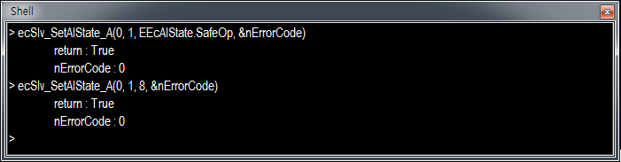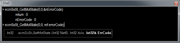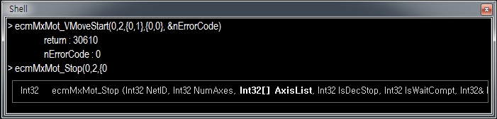 원본 보기토론이전 판역링크책에 추가PDF로 내보내기맨 위로 목차 DataType에 따른 파라메타 입력 순차실행 책 생성기 내 책으로 이 페이지 추가 책 생성기 내 책에서 이 페이지 제거 책 관리(0 페이지) 도움말 Normal Mode : API 단위 입력 × API 단위 입력 테스트가 가능한 노멀모드에 대한 안내 페이지입니다. DataType에 따른 파라메타 입력 API 입력 시 리턴값과 out에 해당하는 파라메타 값을 출력합니다. 파라메타 간 띄어쓰기는 무시됩니다. API 입력 시 pointer나 out에 해당하는 파라메타는 '&' 또는 'ref' 를 붙여 입력합니다. Struct 형도 표시됩니다. ecmSxSt_GetMotState(0, 0, &nErrorCode) ecmSxSt_GetMotState(0, 0, ref errorCode) ecCfg_GetNetConfig(0, &Header, ref error) 배열은 중괄호 { } 로 묶어줍니다. ecmMxMot_VMoveStart(0, 2, {0, 1}, {0, 0}, &nErrorCode) ecmMxMot_Stop(0, 2, {0, 1}, 0, 1, &nErrorCode) Enum 은 Enum 형과 int 형 모두 입력 가능합니다. ecSlv_SetAlState_A(0, 1, EEcAlState.SafeOp, &nErrorCode) ecSlv_SetAlState_A(0, 1, 8, &nErrorCode) 출력은 Enum 값의 string형입니다. 순차실행 여러개의 API를 세미콜론(;)으로 연결하면 지연 없이 순차 실행됩니다. ecmSxSt_GetMotState(0,0,&error);ecmSxSt_GetMotState(0,1,&error) comizoa, 커미조아, ide, shell, 기능, api, test comizoa 커미조아 ide shell 기능 api test