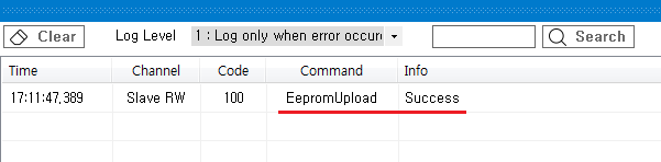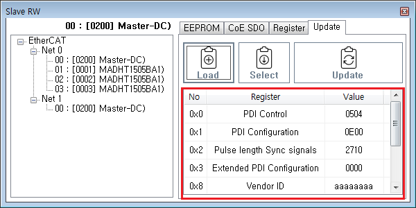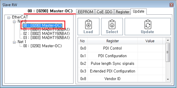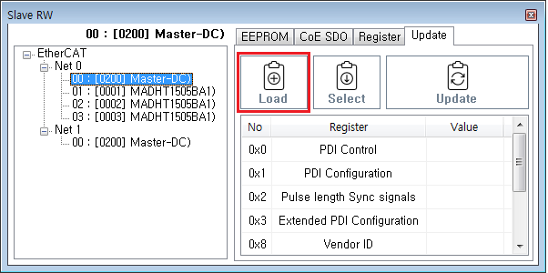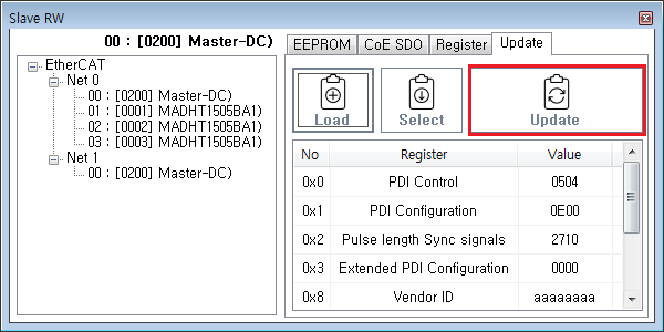 원본 보기토론이전 판역링크책에 추가PDF로 내보내기맨 위로 목차 시작하기 Update 진행하기 책 생성기 내 책으로 이 페이지 추가 책 생성기 내 책에서 이 페이지 제거 책 관리(0 페이지) 도움말 EEPROM Update × EtherCAT Slave의 EEPROM Update에 대한 안내 페이지입니다. 시작하기 ComiIDE의 Main - Tool II SlaveRW 을 클릭하여 SlaveRW를 실행 Update 을 클릭하여 Update 메뉴 실행 Update 진행하기 SlaveList 에서 Update 진행할 Slave 선택 이후 안내에서는 MASTER-DC 사용 Load 을 클릭하여 slaveList 를 불러옵니다. Slave List 에서 Slave를 선택합니다. ProductCode가 동일한 모듈의 경우, RevisionNo로 구분됩니다. Update할 정보를 확인합니다. Update 을 클릭하여 Update 를 진행합니다. LogView 를 통해 Update 성공 여부를 확인합니다. comizoa, 커미조아, ide, ethercat, 기능, esc, eeprom, update comizoa 커미조아 ide ethercat 기능 esc eeprom update