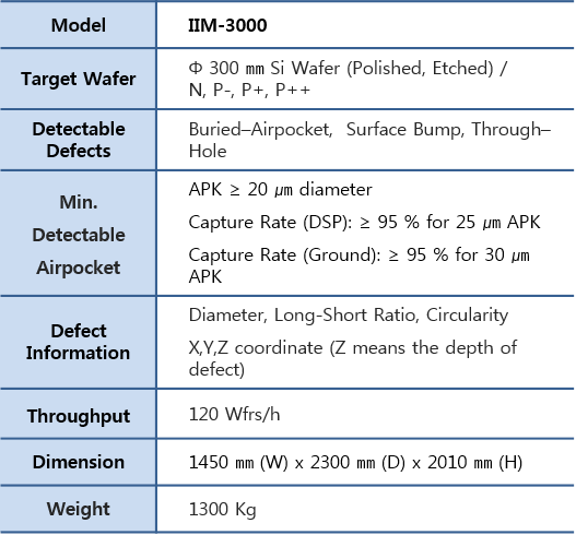 Show pagesourceDiscussionOld revisionsBacklinksAdd to bookExport to PDFBack to top Table of Contents OverView Specifications OverView Book Creator Add this page to your book Book Creator Remove this page from your book Manage book(0 page(s)) Help OverView Specifications OverView IIM-3000 is a equipment that detects all defects and measures the size of each defect on 300 mm Si wafers. Followings are the types of defects that IIM-3000 can detect ; Buried airpockets, Bumps and Through-holes. The advanced defect detection and classification algorithms, enable users to detect easily all defects in various Si wafers(N. P-, P +, P ++) with high throughput. A specialized controller for IIM-3000 provides the optimized control unit, which enables easy maintenance and quick setup. By applying optimized software, IIM-3000 provides reliable inspection quality and result data for users also.