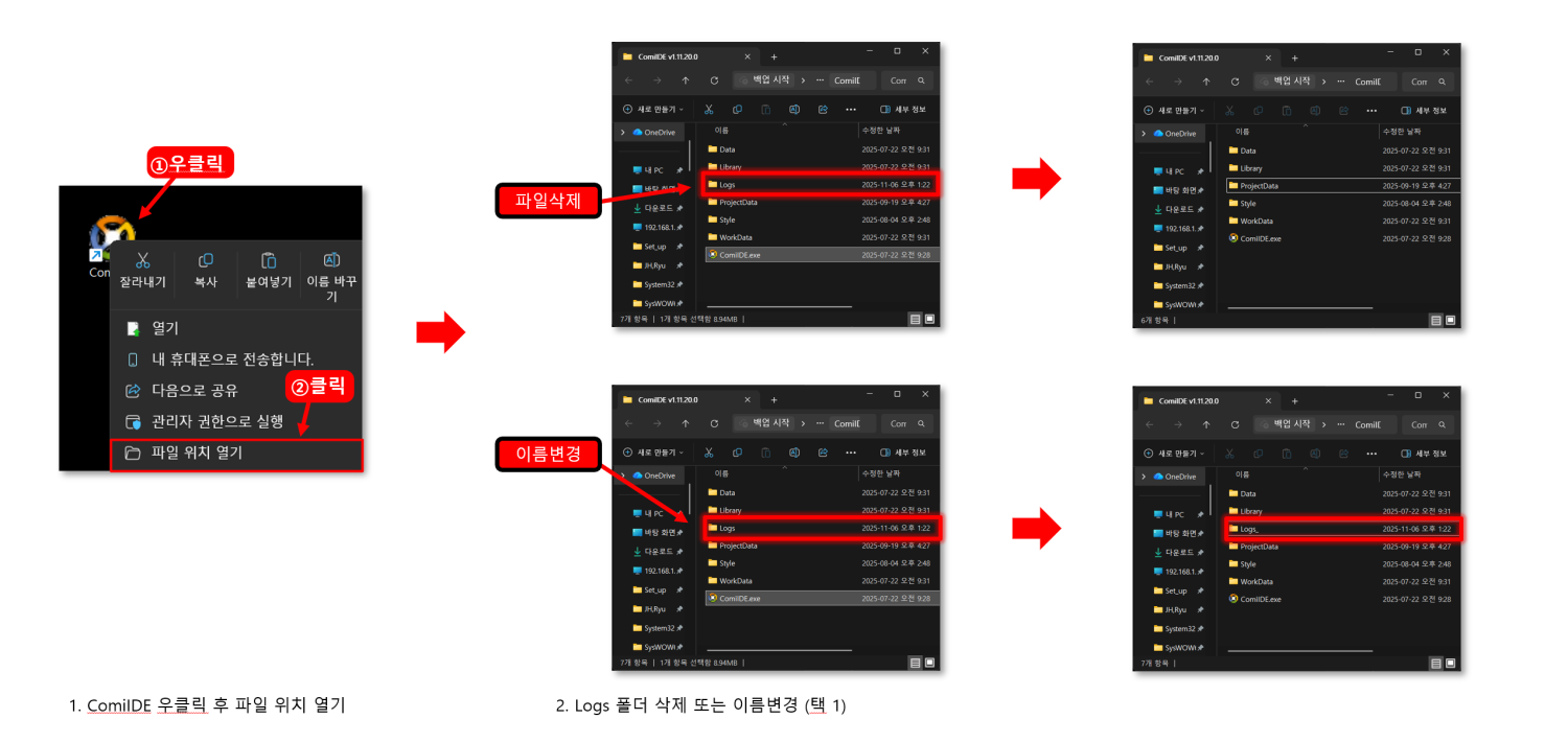 원본 보기토론이전 판역링크책에 추가PDF로 내보내기맨 위로 목차 개요 원인 해결법 1. 손상된 설정 파일 (cpf / cec) 2. Log 폴더 정리 > 손상된 설정 파일 및 Log 폴더 정리 후 ComiIDE를 다시 실행합니다. 책 생성기 내 책으로 이 페이지 추가 책 생성기 내 책에서 이 페이지 제거 책 관리(0 페이지) 도움말 ComiIDE 초기화 × ComiIDE 실행 시 로딩 화면에서 멈출 때 초기화 안내 페이지 개요 ComiIDE를 실행할 때 로딩 화면에서 메인 화면으로 넘어가지 않는 경우가 간혹 발생할 수 있습니다. 이 문서는 이러한 상황에서 사용자가 직접 초기화하여 정상적으로 프로그램을 실행할 수 있는 방법을 정리한 안내 페이지입니다. 원인 아래와 같은 파일 손상 또는 설정 충돌이 발생하면 로딩 단계에서 진입이 지연되거나 멈출 수 있습니다. 1. 환경 설정 파일 손상 프로젝트 설정 파일 (.cpf), EtherCAT 설정 파일 (.cec) 등이 비정상 종료, 전원 차단 등의 이유로 손상될 수 있음 손상된 설정 파일은 로딩 과정에서 충돌을 일으켜 프로그램 메인 화면까지 진입하지 못하게 함. 2. 로그 파일 과다 생성 또는 오류 ComiIDE 설치 폴더 내 Log 폴더에 오류 로그가 누적되거나, 특정 로그 파일이 깨진 경우 정상 로딩을 방해할 수 있음. 해결법 - 아래 두가지 안내를 따라 주세요. 1. 손상된 설정 파일 (cpf / cec) 1. ComiIDE를 완전히 종료합니다. 2. %appdata% 경로에서 아래 파일을 확인합니다. C:\Users\USER\AppData\Roaming\COMIZOA\ CEcatNetCfg_0_0.cec C:\Users\USER\AppData\Roaming\COMIZOA\ComiIDE\ ConfigData.cpf 3. 해당 파일을 삭제합니다. 2. Log 폴더 정리 1. ComiIDE 폴더에서 Log 폴더 삭제 or 이름 변경합니다. > 손상된 설정 파일 및 Log 폴더 정리 후 ComiIDE를 다시 실행합니다.