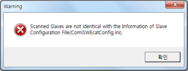 원본 보기토론이전 판역링크책에 추가PDF로 내보내기맨 위로 목차 1. .ini 파일의 슬레이브 정보가 변경되지 않은 경우 증상 원인 해결법 책 생성기 내 책으로 이 페이지 추가 책 생성기 내 책에서 이 페이지 제거 책 관리(0 페이지) 도움말 ComiSWEcatConfig.ini 파일 이슈 × SW 이더캣 마스터 Daemon 실행시 Scanned Slaves are not identical with the Information of Slave Configuration File 라는 메시지가 뜨는 현상에 대한 안내 페이지입니다. 1. .ini 파일의 슬레이브 정보가 변경되지 않은 경우 증상 처음 SW 이더캣 마스터를 셋업 진행할때 Daemon 실행 시 Scanned Slaves are not identical with the Information of Slave Configuration File 메시지 발생 슬레이브 연결 상태를 변경 후 Daemon 실행 시 Scanned Slaves are not identical with the Information of Slave Configuration File 메시지 발생 원인 Daemon에서 슬레이브 스캔을 했을 때 슬레이브 정보가 담긴 ComiSWEcatConfig.ini 파일의 내용과 현재 스캔된 디바이스의 내용이 다름. 해결법 Scan Slaves 클릭 Update Cfg. 클릭 1) 1) 이 버튼 클릭시 ComiSWEcatConfig.ini 파일이 업데이트 됨