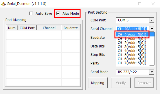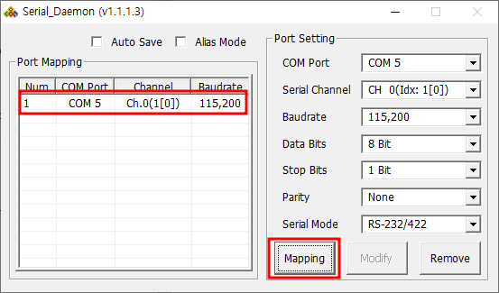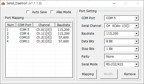 원본 보기토론이전 판역링크책에 추가PDF로 내보내기맨 위로 목차 1. Comizoa Serial Daemon 소개 2. 프로그램 사용 전 Setup 가상 드라이버 설치 커미조아 EtherCAT Master Configuration Serial Daemon Licence Key 발급 3. 프로그램 사용 시리얼 COM Port 선택 이더캣 슬레이브 Serial Channel 선택 시리얼 통신 설정 선택 Mapping 정보 등록 Mapping 취소 Mapping 정보 저장 Serial 통신 사용 책 생성기 내 책으로 이 페이지 추가 책 생성기 내 책에서 이 페이지 제거 책 관리(0 페이지) 도움말 Comizoa Serial Daemon 소개 및 사용방법 안내 × Comizoa Serial Daemon 소개 및 사용방법에 대한 안내페이지입니다. × Serial Daemon 사용 전 반드시 Comizoa EtherCAT 통신 및 가상 시리얼 통신 드라이버가 정상적으로 동작해야 합니다. 1. Comizoa Serial Daemon 소개 Serial Daemon은 커미조아 이더캣 시리얼 통신 슬레이브1)의 PDO,SDO 통신과 커미조아 가상 시리얼 드라이버간 통신 데이터 컨버팅을 백그라운드에서 자동으로 실행해 일반적인 Windows 시리얼 통신 방식으로 이더캣 슬레이브 제어를 가능하게 하는 프로그램입니다. 2. 프로그램 사용 전 Setup 가상 드라이버 설치 가상 시리얼 드라이버 설치 매뉴얼 다운로드 커미조아 EtherCAT Master Configuration PCI 이더캣 마스터 셋업 방법 안내 Serial Daemon Licence Key 발급 Serial Daemon은 프로그램 사용 전 프로그램 사용 관련 라이센스를 발급 받아야 하며 관련 내용은 Comizoa 영업팀에 문의가 필요합니다. Serial Daemon 라이센스 키 적용 방법 매뉴얼 다운로드 3. 프로그램 사용 시리얼 COM Port 선택 가상 시리얼 드라이버로 셋업한 COM Port를 선택합니다. 이더캣 슬레이브 Serial Channel 선택 ComboBox에서 현재 마스터에 등록된 ECAT Serial Slave중 어떤 채널과 COM Port를 Mapping할 지 선택합니다. 기본 모드에서의 Serial Channel의 의미는 다음과 같습니다 {시리얼 슬레이브의 채널 번호}(idx:{이더캣 슬레이브 인덱스} [{시리얼슬레이브 인덱스}] 위와 같은 경우 1번째로 연결된 이더캣 슬레이브의 0번 시리얼 채널을 선택한 것과 같습니다. Alias 모드 사용시 Serial Channel의 의미는 다음과 같습니다 {시리얼 슬레이브의 채널 번호}(idx:{이더캣 슬레이브 물리 주소} [{시리얼슬레이브 인덱스}] 위와 같은 경우 Physical Address가 5인 이더캣 슬레이브의 0번 시리얼 채널을 선택한 것과 같습니다. 시리얼 통신 설정 선택 시리얼 통신 설정을 입력합니다. Mapping 정보 등록 시리얼 통신 Mapping 정보 입력이 된 후 Mapping 버튼을 클릭해 해당 정보를 프로그램에 등록합니다. Mapping 취소 등록된 Mapping 정보를 제거하려면 해당 정보 클릭 후 Remove 버튼을 클릭합니다. Mapping 정보 저장 시리얼 통신 Mapping 정보 입력이 모두 완료되면 Mapping 정보를 Info.INI 파일에 저장합니다. 저장 방법은 다음과 같습니다 프로그램 종료시 저장 여부를 확인할 때 예 버튼 선택 Auto Save 체크박스 체크시 자동 저장 Info.ini 파일에 Mapping 정보가 저장된 후 프로그램 다시 시작시 Mapping 정보가 자동으로 등록됩니다. Serial 통신 사용 Serial Daemon에 Mapping이 완료되었다면 일반적인 Windows Serial 통신처럼 EtherCAT Slave 제어가 가능합니다. 1) ETS-SC08A