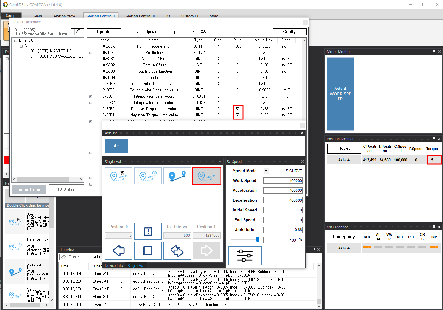 원본 보기토론이전 판역링크책에 추가PDF로 내보내기맨 위로 목차 토크 제한 설정 1. Configurator에서 Download후 Dictionary 2. SDO 내에서 Torque Limit 설정 책 생성기 내 책으로 이 페이지 추가 책 생성기 내 책에서 이 페이지 제거 책 관리(0 페이지) 도움말 토크 제한 설정 × 토크 제한 (Torque Limit) 설정에 대한 안내페이지입니다. [야스카와 서보 사용] 1. Configurator에서 Download후 Dictionary Config→ Download 후 Main에서 Dictionary 클릭 2. SDO 내에서 Torque Limit 설정 해당 서보 내의SDO에서 Torque Limit 관련 설정 찾기 해당 Value 더블 클릭. Value 값 수정 후 enter. * 단축 이송에서 Velocity 모드로 설정, 이송 후 외부적인 힘을 가해 Limit이 설정한 값으로 올라오는지 확인 * Torque Limit 설정이 없거나 서보의 다른 기능으로 Torque Limit과 비슷한 제어를 할 시, 해당 서보 업체에 확인 필요. (Ex: 웰콘 서보 = Maximum Current)