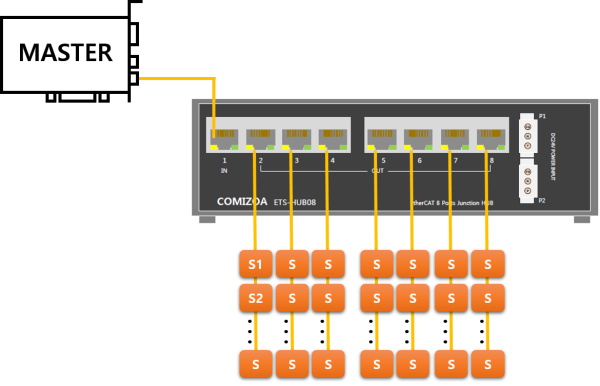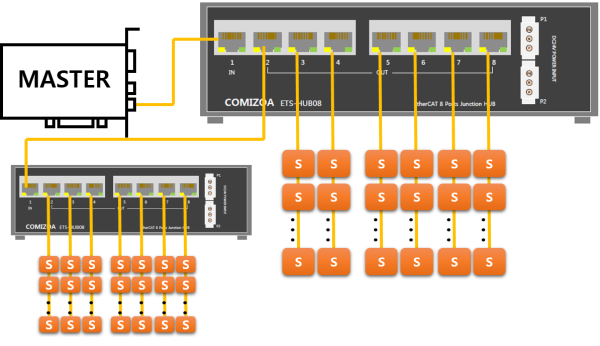 원본 보기토론이전 판역링크책에 추가PDF로 내보내기맨 위로 목차 트리 트리 구성 트리 확장 책 생성기 내 책으로 이 페이지 추가 책 생성기 내 책에서 이 페이지 제거 책 관리(0 페이지) 도움말 트리 × 슬레이브 모듈 연결 방법 중 트리 연결에 대한 안내 페이지입니다. 트리 구성 EtherCAT-HUB를 이용하는 경우 트리 구성이 가능합니다. 일반적으로 허브의 1번포트는 'ECAT IN', 나머지 포트는 'ECAT OUT'입니다. 4포트의 경우, 1번포트 - 'ECAT IN' / 2,3,4번 포트 - 'ECAT OUT' 6포트의 경우, 1번포트 - 'ECAT IN' / 2,3,4,5,6번 포트 - 'ECAT OUT' 8포트의 경우, 1번포트 - 'ECAT IN' / 2,3,4,5,6,7,8번 포트 - 'ECAT OUT' 상세 내용은 제조사 매뉴얼 참조 하위 노선에 문제가 발생하는 경우 해당 라인의 모듈들은 Disconnect로 처리됩니다. 상위 노선에 문제가 발생하는 경우, 하위 라인의 모듈 모두 Disconnect로 처리됩니다. 트리 확장 트리는 확장이 가능합니다. × 트리가 증가할 수록 연결에 대한 유연성은 높아지지만, 통신 문제 발생 시 원인 분석이 어려워집니다. 복잡한 구성 및 2개 이상의 허브 사용은 권장하지 않습니다.