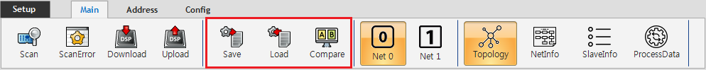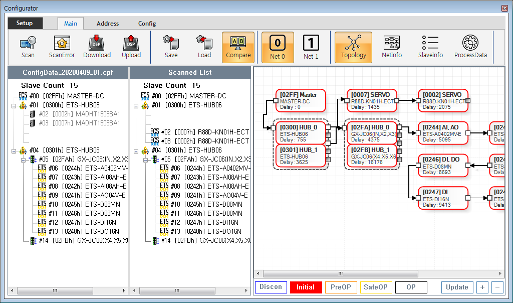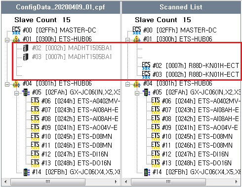 원본 보기토론이전 판역링크책에 추가PDF로 내보내기맨 위로 목차 Project Manager Compare 책 생성기 내 책으로 이 페이지 추가 책 생성기 내 책에서 이 페이지 제거 책 관리(0 페이지) 도움말 Project Manager × Configuration 결과를 Project file 로 관리할 수 있습니다. Save Configuration 내용을 Project File (.cpf) 로 저장합니다. Download 시에는 자동 저장됩니다. “.\ComiIDE\ProjectData\Config” 폴더에 “ConfigData.cpf” 로 저장됩니다. 저장 시 기존 파일은 파일 생성 일자를 반영하여 “ConfigData_yyyyMMdd.cpf” 형식으로 백업됩니다. Load Project File로부터 Configuration 내용을 불러옵니다. Configurator 실행 시 “ConfigData.cpf” 파일이 존재하면 자동으로 불러옵니다. Compare 현재 Configuration 내용과 Project File의 Configuration 내을을 비교하여 트리로 표시합니다. Compare Compare 클릭 시 비교할 Project file을 불러올 수 있습니다. 불러 온 내용은 왼쪽에 현재의 스캔 결과는 오른쪽에 표시됩니다. 위 예제는 MADHT1505BA1 모듈 두개가 R88D-KN01H-ECT로 변경되었음을 나타냅니다. 제거 된 모듈은 기존 프로젝트 리스트에는 회색으로, 현재 모듈리스트에는 공백으로 표시됩니다. 추가 된 모듈은 기존 프로젝트 리스트에 공백으로 표시됩니다.