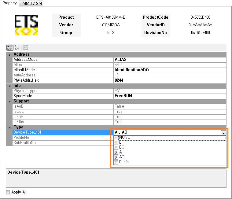 원본 보기토론이전 판역링크책에 추가PDF로 내보내기맨 위로 목차 Slave Info 구성 Address Setup Property FMMU / SM 책 생성기 내 책으로 이 페이지 추가 책 생성기 내 책에서 이 페이지 제거 책 관리(0 페이지) 도움말 Slave Info × Configurator의 Slave Information Tab 에 대한 안내 페이지입니다. Address, SyncMode, DeviceType 등을 변경할 수 있습니다. SlaveInfo 버튼을 클릭하여 활성화 합니다. 기능 ESI 파일에서 읽은 Slave 정보 확인 Address 변경 SyncMode 변경 구성 1 - Info Slave의 Type을 결정하는 기본적인 정보를 표시합니다. 2 - Property Slave의 옵션을 나타냅니다. 기본값(default)은 ESI 파일에서 불러옵니다. 활성화된 항목은 변경이 가능합니다. 3 - Apply All 활성화 시, 변경된 값은 동일한 Type의 Slave에 모두 적용됩니다. VendorID 와 ProductCode가 같다면 동일한 Type으로 판단합니다. Address Setup A - AddressMode ALIAS : Master가 Slave의 Address를 설정하는 방식입니다. 변경된 주소는 Slave 전원 재투입 시 유효합니다. 주소가 변경된 후 전원이 재투입되지 않으면 OP Mode로의 변경이 불가합니다. CSA : 일부 ALIAS 방식을 지원하지 않는 Slave의 주소 설정 방식입니다. 일부 ELMO 드라이버등에서 사용합니다. 대부분의 슬레이브는 ALIAS 모드를 사용하므로 해당 항목은 별도 설정하지 않습니다. B - AliasILMode IdentificationADO : Slave에서 지정한 ESC Memory를 읽어 주소를 확인합니다. IdentificationReg134 : Slave로부터 직접 주소를 획득합니다. MicroController 와 ID를 위한 Switch가 지원되는 대부분의 모듈에서 사용됩니다. AliasILMode는 슬레이브에서 제공되는 방식을 따르므로(esi 파일에서 확인) 별도 설정하지 않습니다. C - PhysAddr_Hex 16진수로 표시되는 Address이며, 주소가 0이거나 다른 값으로 변경해야 하는 경우 해당값을 변경합니다. 402 Profile(Driver)이 아닌 IO 모듈은 BaseAddress를 지원합니다. × Address가 변경된 경우 Download 후 반드시 Slave의 전원을 재투입해야 합니다. Property D - SyncMode 동기모드에 대한 리스트는 해당 슬레이브의 xml에서 읽어옵니다. 따라서 xml에 없는 mode는 표시되지 않습니다. xml에 동기모드에 대한 정보가 없는 경우, 해당 칸은 비활성화 되며, FreeRUN으로 자동 설정됩니다. E - DeviceType_401 DeviceType 이 401인 모듈 선택 시 보여집니다. 변경 시 DeviceType도 변경되면, 해당 타입에 채널이 할당 됩니다. “DI Info” Type 선택 시, DI 채널은 할당되지 않습니다. DO 모듈의 DeviceID 등이 PDO로 할당되는 경우 대해 제한적으로 사용됩니다. FMMU / SM FMMU Slave의 FMMU설정을 확인할 수 있습니다. SM Slave의 SyncManager설정을 확인할 수 있습니다.