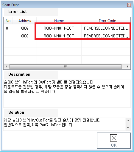 원본 보기토론이전 판역링크책에 추가PDF로 내보내기맨 위로 목차 Reverse Connection Check Info 책 생성기 내 책으로 이 페이지 추가 책 생성기 내 책에서 이 페이지 제거 책 관리(0 페이지) 도움말 Reverse Connection Check × Inport와 Outport가 잘못 연결된 Slave를 찾습니다. MisConnect 버튼을 클릭하여 잘못 연결된 Slave를 찾습니다. Inport와 Outport가 잘못 연결 된 Slave는 TopologyView에서 파란색 점선으로 표시됩니다. Scan Error에서는 'REVERSER_CONNECTED_SLAVE'로 에러 처리됩니다. Info EtherCAT Slave는 Inport와 Outport가 구분되어 연결됩니다. Inport와 Outport가 바뀐 경우 의도치 않은 순서로 연결되어 전체 Topology가 변경됩니다. 특히 두개 이상의 Slave가 잘못 연결된 경우, 정상적인 통신이 불가능할 수 있습니다. SCAN 완료 시, 결과 표시 전 해당 작업이 자동으로 수행됩니다. × 잘못 연결된 모듈이 발견될 경우, 반드시 올바른 상태로 변경하시기 바랍니다.