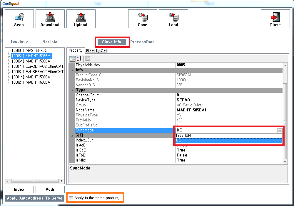 원본 보기토론이전 판역링크책에 추가PDF로 내보내기맨 위로 문서의 이전 판입니다! EtherCAT 통신의 동기 Mode × 동기 모드 설정에 대한 안내 페이지입니다. 설정방법 Slave Info - Property 에서 변경 할 수 있습니다. 동기모드에 대한 리스트는 해당 슬레이브의 xml에서 읽어옵니다. 따라서 xml에 없는 mode는 표시되지 않습니다. xml에 동기모드에 대한 정보가 없는 경우, 해당 칸은 비활성화 되며, FreeRUN으로 자동 설정됩니다. 하단의 “Apply to the same product”에 체크한 후, 값을 변경하면 동일한 슬레이브1)에 대해서 모두 변경값이 적용됩니다. Download 이후 유효합니다. 동기모드의 종류 FreeRun : 마스터와 슬레이브가 비동기로 동작합니다. SM2 Event : 슬레이브는 주기적 데이터 (RxPDO)가 수신될 때마다 SM2 Event를 발생하며, 이 Event에 동기하여 동작합니다. DC : 마스터와 슬레이브가 같은 시계를 공유하여, 정확한 동기로 Sync0 Event(Interrupt)를 발생시킵니다. 마스터와 슬레이브는 이 Event에 동기하여 동작합니다. 1) VendorID 와 ProductCode가 같은 슬레이브