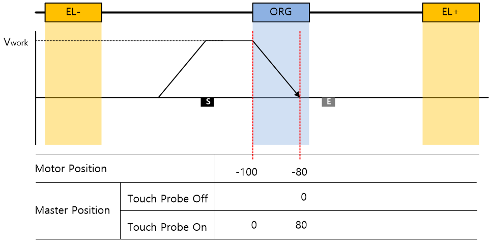 원본 보기토론이전 판역링크책에 추가PDF로 내보내기맨 위로 목차 터치프로브 사용 시의 원점복귀 완료 위치 터치프로브 사용 여부에 따른 원점복귀 완료 위치 터치프로브 사용 시의 원점복귀 완료 위치 × 터치프로브 사용시의 원점 복귀 완료 위치 변화에 대한 안내 페이지입니다. 터치프로브 사용 여부에 따른 원점복귀 완료 위치 터치 프로브 소개 터치프로브 미사용 시, 원점 완료 기준 위치는 모터 정지 위치입니다. 마스터에서는 정지 위치를 0으로 간주합니다. 예시에서, Motor Position 이 -80인 위치를 마스터에서는 0으로 표시합니다. 터치프로브 사용 시, 원점 완료 기준 위치는 ORG 센서 감지 위치입니다. 마스터에서는 센서 감지 위치를 0으로 간주합니다. 예시에서, Motor Position 이 -100인 위치를 마스터에서는 0으로 표시합니다. 센서 감지 후, 감속에 따른 이송거리는 실제 위치로 표시됩니다. 원점 완료 후, 마스터에서 표시되는 위치는 80입니다. ×원점 센서 감지 후, 감속에 따른 추가 이송 거리는, 센서 감지시의 속도와 감속도에 따라 달라집니다. 터치프로브를 사용하면, 감속에 따른 추가 이송량이 배제되므로 더 정밀합니다.