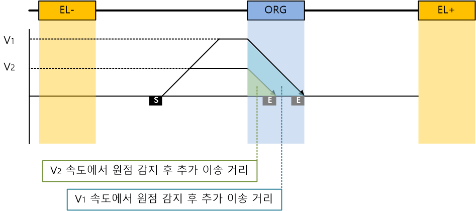 원본 보기토론이전 판역링크책에 추가PDF로 내보내기맨 위로 목차 원점복귀 속도에 따른 완료 위치 편차 속도에 따른 위치 편차 원점복귀 속도에 따른 완료 위치 편차 × 원점복귀 속도에 따라 완료 위치의 편차가 발생할 수 있습니다. 속도에 따른 위치 편차 원점 복귀는 설정된 방향으로 이송 중, 원점 센서를 감지하면 정지하는 방식입니다. 속도가 빠른 경우 원점 감지 후 감속 시작 시점이 늦어질 수 있습니다. 감속시작 후 정지까지의 이송거리가 길어집니다. 총 이송량이 커지므로, 편차도 커지며, 반복 정밀도가 낮아질 수 있습니다. 속도가 느린 경우 원점복귀 완료 시간이 길어질 수 있습니다. 따라서, 2단계에 걸친 원점 복귀 방식이 권장됩니다.