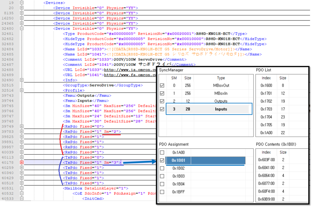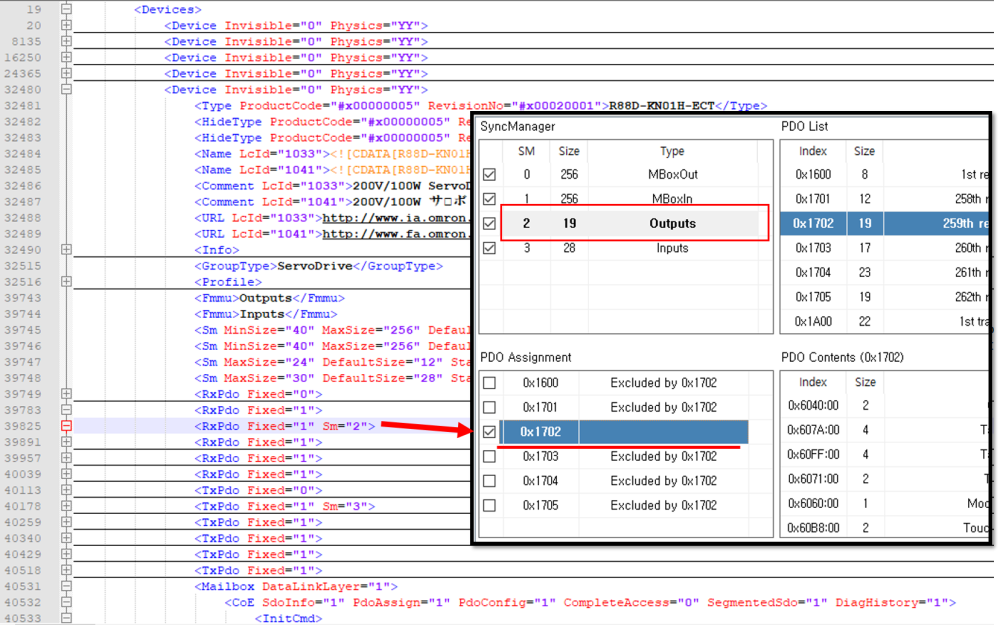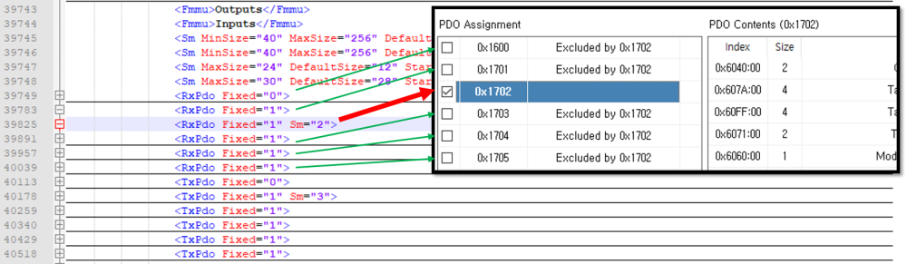 원본 보기토론이전 판역링크책에 추가PDF로 내보내기맨 위로 목차 기본 PDO MAP 변경 Intro ESI File 수정 기본 PDO MAP 변경 × ESI 파일에서 제공되는 기본 PDO Map 변경에 대한 안내 페이지입니다. Intro SCAN을 진행하게 되면 각 슬레이브별로 'PDO Assignment' 가 자동으로 선택됩니다. 자동으로 선택되는 항목은 슬레이브의 ESI 파일1)에 지정되어 있습니다. 'PDO Contents' 항목에 원하는 항목이 없는 경우 슬레이브 별로 'PDO Assignment'를 변경해야 합니다. 보통 토크제어를 하거나 현재 토크를 확인해야 하는 경우, 'Target Torque' 또는 'Current Torque' 항목이 포함된 PDO Map(0x1702)으로 변경합니다. 변경 후에도 SCAN을 다시 진행하면 esi 파일의 값을 읽기 때문에, 값은 초기화됩니다. 기본값을 변경하기 위해서는 ESI 파일을 수정해야 합니다. ESI File 수정 예시 환경은 다음과 같습니다. OMRON 드라이버 사용, Torque 제어 및 확인을 위해 PDO Map 변경 'SlaveInfo' 탭에서 ProductCode, RevisionNo를 확인합니다. 'ProcessData' 탭에서 변경해야할 PDO Map을 확인합니다. 예시의 경우 'Target Troque' 항목이 있는 Map 확인 : 0x1702 XML Editor2)를 이용해 esi 파일을 열고, ProductCode와 RevisionNo가 일치하는 노드를 찾습니다. '<RxPdo Fixed=“0”>' 형식으로 표시되는 항목은 'SyncManager'의 Outputs 항목입니다. 'Sm=“2”로 표시된 노드가 자동 선택되는 노드입니다. 다른 노드에 'Sm=“2” 를 추가할 경우, 해당 노드가 자동 선택됩니다. '<TxPdo Fixed=“0”>' 형식으로 표시되는 항목은 'SyncManager'의 Inputs 항목입니다. 'Sm=“3”로 표시된 노드가 자동 선택되는 노드입니다. 변경 완료 후 저장합니다. Configurator를 재실행한 후 SCAN을 진행합니다. 1) .xml 형태로 제공되는 슬레이브 설정 파일 2) Notepad, Notepad++, Ultra Editor 등