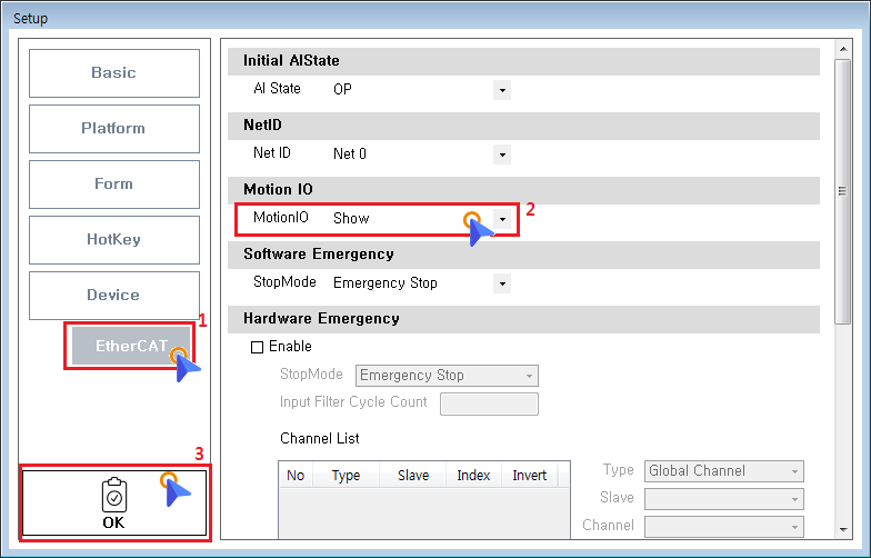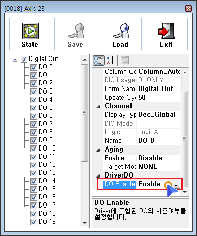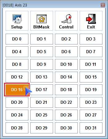 원본 보기토론이전 판역링크책에 추가PDF로 내보내기맨 위로 목차 준비 설정 테스트 DriverIO × 402 Profile을 준수하는 Driver에 포함된 Digital Output Signal의 테스트 안내 페이지입니다. 준비 Firmware 1.94 이상에서 테스트 가능합니다. ComiIDE v1.4.1.0 이상에서 테스트 가능합니다. 설정 Menu - EtherCAT Page에서 MotionIO를 'Show'로 선택한 후 OK 버튼을 클릭합니다 Scan 버튼을 클릭하여, 스캔을 재실행합니다. Device List에서 Axis와 Axis에 포함된 'Digital Output'이 정상적으로 표시되는지 확인합니다. MotionIO가 'Hide'인 경우, Device List에 Axis가 표시되지 않습니다. Device List에서 'Digital Output'을 클릭하면, 제어 창이 표시됩니다. Menu - IO 탭에서 Axis가 'Digital Output'으로 표시되며, 버튼 클릭 시 동일하게 제어창이 표시됩니다. 제어창의 Setup 버튼을 클릭합니다. DriverDO 탭의 DO Enable을 'Enable'로 변경합니다. DO Enable은 이후 변경할 BitMask값을 저장하는 역할입니다. 일회성 테스트인 경우, 설정하지 않아도 무방합니다. BitMask 버튼을 클릭합니다. 사용할 BitMask를 클릭하여 해당 Bit를 Enable로 변경합니다. Bit는 채널을 의미합니다. 사용 가능한 채널은 각 드라이버의 매뉴얼을 참조하시기 바랍니다. 일반적으로 Bit0 은 Motor의 Break 신호로 사용하며, Bit16~Bit31 을 범용으로 사용합니다. 테스트 State 버튼을 클릭하여 제어화면을 표시합니다. 버튼을 클릭하여 신호를 출력합니다. BitMask 가 'Enable' 된 채널에 대해서만 신호가 출력됩니다.