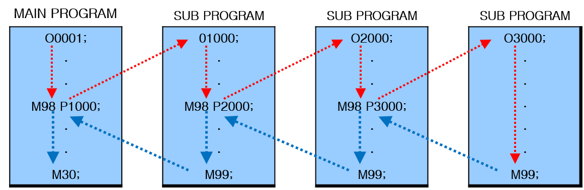 원본 보기토론이전 판역링크책에 추가PDF로 내보내기맨 위로 목차 M98 / M99 (서브루틴 호출) Summary Format 책 생성기 내 책으로 이 페이지 추가 책 생성기 내 책에서 이 페이지 제거 책 관리(0 페이지) 도움말 M98 / M99 (서브루틴 호출) Summary M98 : 서브 프로그램 호출 M99 : 서브 프로그램 호출 종료 명시적으로 호출하지 않은 경우에도, 서브 프로그램이 모두 실행되면 자동 종료됩니다. Format M98 P_ P : 프로그램 번호 M99