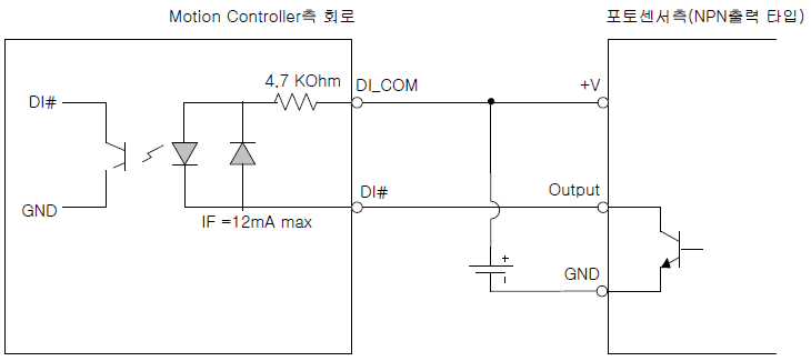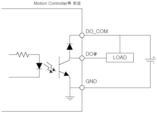 원본 보기토론이전 판역링크책에 추가PDF로 내보내기맨 위로 목차 CMP 출력 신호 범용 디지털 입력 신호 범용 디지털 출력 신호 책 생성기 내 책으로 이 페이지 추가 책 생성기 내 책에서 이 페이지 제거 책 관리(0 페이지) 도움말 기타 입출력 신호 × 기타 입출력 신호에 대한 안내 페이지입니다. CMP 출력 신호 COMI-LX50x 시리즈 모션 제어 제품은 각 축마다 위치 비교 출력 기능1)을 제공합니다. CMP 기능을 사용하면 모션을 구동하면서 연속으로 원하는 위치에서 외부기기에 하드웨어 트리거 신호를 제공할 수 있습니다. 특히 Machine Vision 시스템에서 유용하게 사용될 수 있습니다. 이에 대한 자세한 내용은 소프트웨어 모션 라이브러리 매뉴얼 [위치비교출력(CMP)]단원을 참조하시기 바랍니다. CMP출력 신호를 트리거 신호로 사용할 때 Active Low(Falling Edge 감지) 방식으로 사용하는 경우와 Active High(Rising Edge 감지) 방식으로 사용하는 각각의 경우 신호의 지연시간은 아래와 같습니다 Active Low 방식 : ≤ 2 ㎲ Active High 방식 : ≤ 40 ㎲ Active Low방식으로 사용하는 것을 권장합니다. CMP출력 신호는 NPN 오픈컬렉터 출력입니다. Target System의 신호 입력 형식이 Isolated Input형식이면 다음과 같이 연결합니다. Target System이 TTL Input 형식이면 다음과 같이 Pull-up 저항을 연결 하여야 합니다. 범용 디지털 입력 신호 ㈜커미조아의 모션 제어제품은 모션제어 전용으로 할당된 입출력 외에 범용 디지털 입력 채널을 제공하며, 포토커플러로 절연되어 있습니다. 제공되는 디지털 입력 채널 수는 제품마다 다르므로 각 제품의 Spec.을 참조하시기 바랍니다. 범용 디지털 입력 채널은 Current sink형식 연결과 Current source 형식의 연결을 모두 지원합니다. NPN Type Sensor와의 연결 방법은 다음과 같습니다. PNP Type Sensor와의 연결 방법은 다음과 같습니다. 범용 디지털 출력 신호 ㈜커미조아의 모션 제어 제품은 모션제어 전용으로 할당된 입출력 외에 범용 디지털 출력 채널을 제공합니다. 제공되는 디지털 출력 채널 수는 제품마다 다르므로 각 제품의 Spec.을 참조하시기 바랍니다. 디지털 출력 회로 및 신호 연결 방식은 다음과 같으며, “Common ground 연결” 방식을 사용합니다. 디지털 출력이 “ON” 상태가 되면 싱크전류(Sink current)가 트랜지스터를 통하여 전도되며, “OFF” 상태가 되면 트랜지스터를 통하여 전류가 흐르지 않게 됩니다. 릴레이, 코일 또는 모터등과 같이 인덕턴스(Inductance) 성질을 가지는 부하(Load)를 구동할 때에는 외부 소스 전원을 DO_COM 핀에도 연결해주어야 합니다.2) 각 디지털 출력 채널당 구동되는 싱크전류(Sink current)는 20mA 이하로 하시기 바랍니다. 1) Command counter 또는 Position Counter의 카운트 값이 사용자가 지정한 조건에 만족되면 CMP 출력핀을 통하여 트리거 펄스를 출력하는 기능 2) “Fly-wheel Diode”를 사용하여 부하가 “ON”에서 “OFF”상태로 변할 때 발생하는 역기전압으로부터 트랜지스터를 보호하기 위함